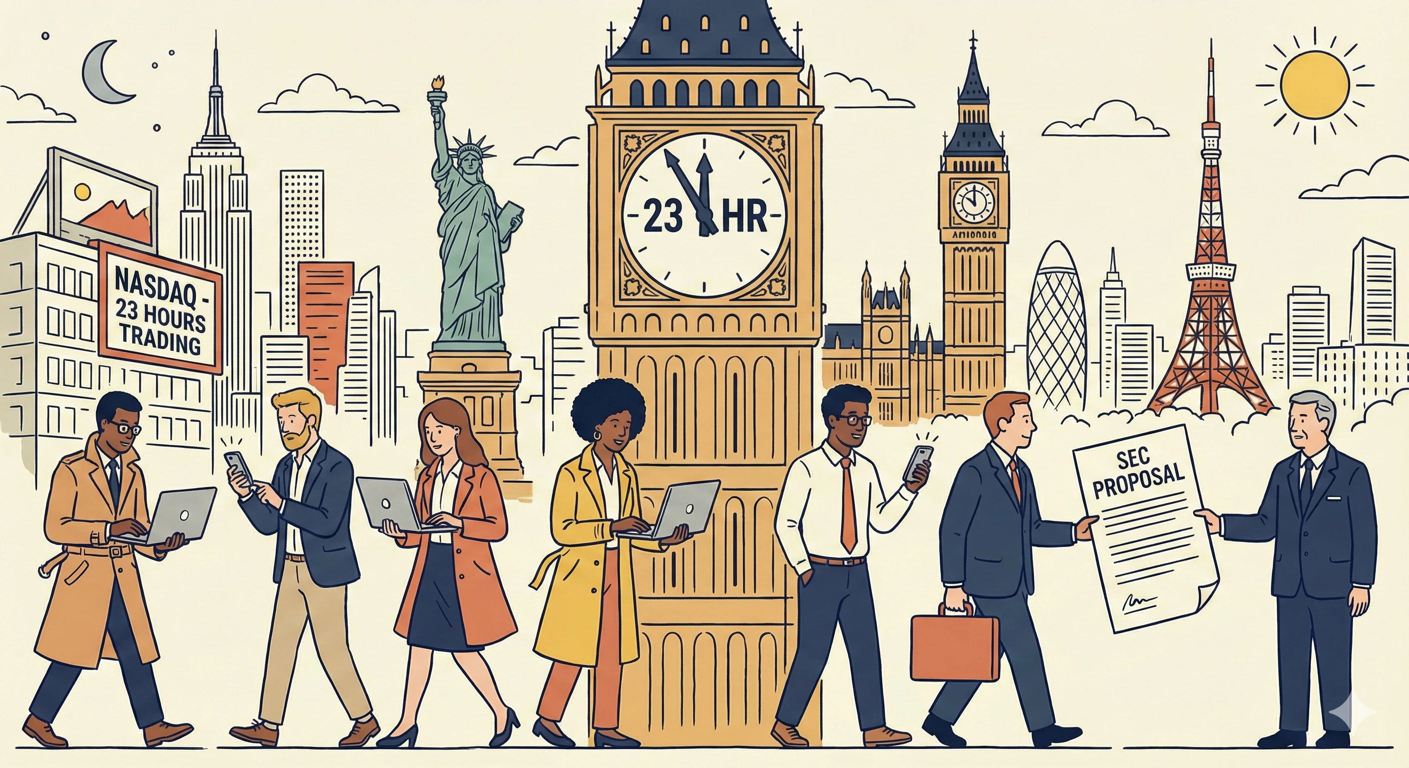 새로운 계획안이 도입되면 나스닥의 거래 시간은 '주간 세션'과 '야간 세션'으로 개편된다. 주간 세션은 오전 4시부터 오후 8시까지 운영되며, 이후 1시간의 시스템 정비 및 결제 시간을 거쳐 오후 9시부터 이튿날 오전 4시까지 야간 세션이 이어진다. 야간 세션인 오후 9시부터 자정 사이의 거래는 다음 날 거래분으로 처리될 예정이다.나스닥의 이번 결정은 미국 주식 시장에 대한 전 세계적 접근성 확대 요구에 따른 것이다. 척 맥 나스닥 북미 시장 담당 수석 부사장은 "미국 시장의 글로벌화 추세가 지속되고 있다"며 "세계 각국의 투자자들은 자신의 시간대에 맞춰 거대 미국 시장에 접근하기를 원한다"고 밝혔다. 나스닥 집계에 따르면 지난해 외국인의 미국 주식 보유액은 17조 달러(약 2경 3400조 원)에 달했다.