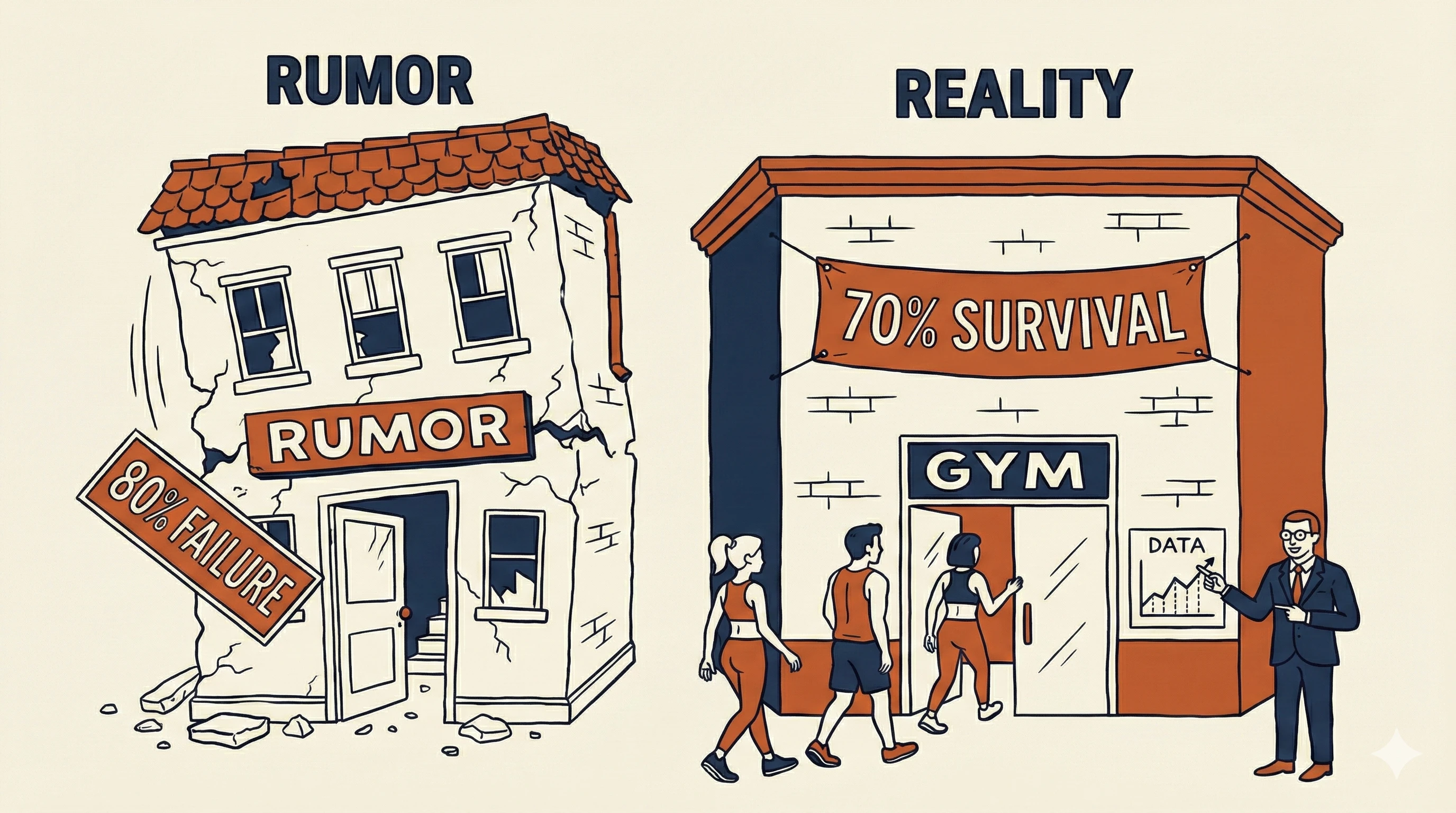 결론적으로 헬스장 산업은 "10개 중 8개가 망하는" 위기 업종이 아니라, 평균 8년 이상 운영되며 70% 가까운 5년 생존율을 보이는 상대적으로 양호한 산업군에 속한다. 잘못된 통계에 근거한 공포 심리 조장은 창업자와 소비자 모두에게 혼란을 줄 수 있는 만큼, 국가 승인 통계인 행정안전부 인허가 데이터에 기반한 정확한 시장 이해가 필요한 시점이다.
