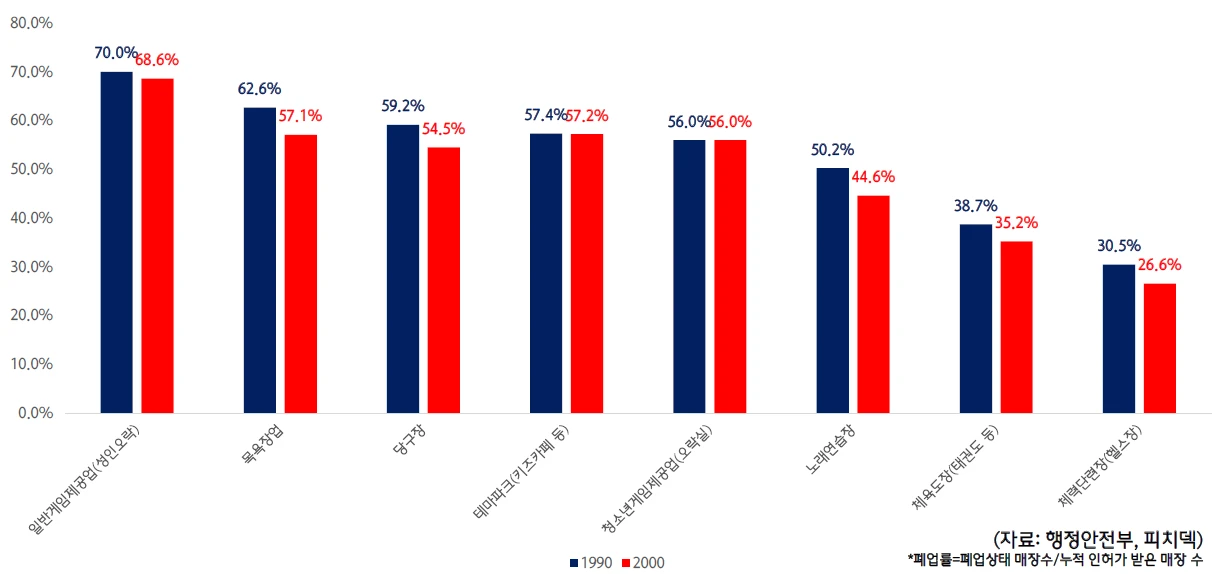 헬스장의 경영 안정성은 타 업종과의 비교에서 더욱 두드러진다. 성인오락실의 경우 누적 폐업률이 기간에 따라 68~70% 수준이고, 당구장은 54~59%, 키자카페는 54~57%, 노래연습장 44%~50%인데 반해 헬스장은 26~30% 수준이다.