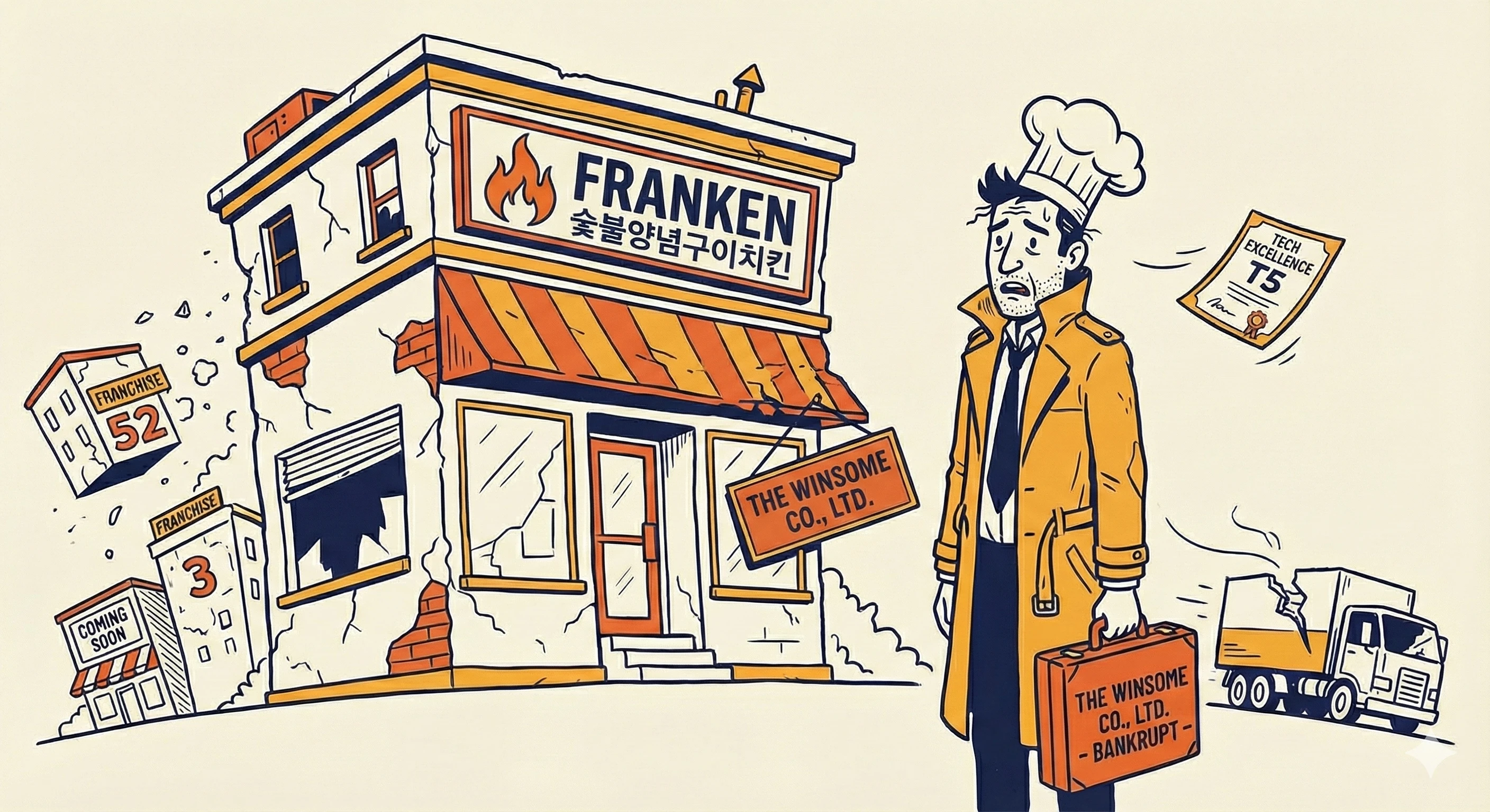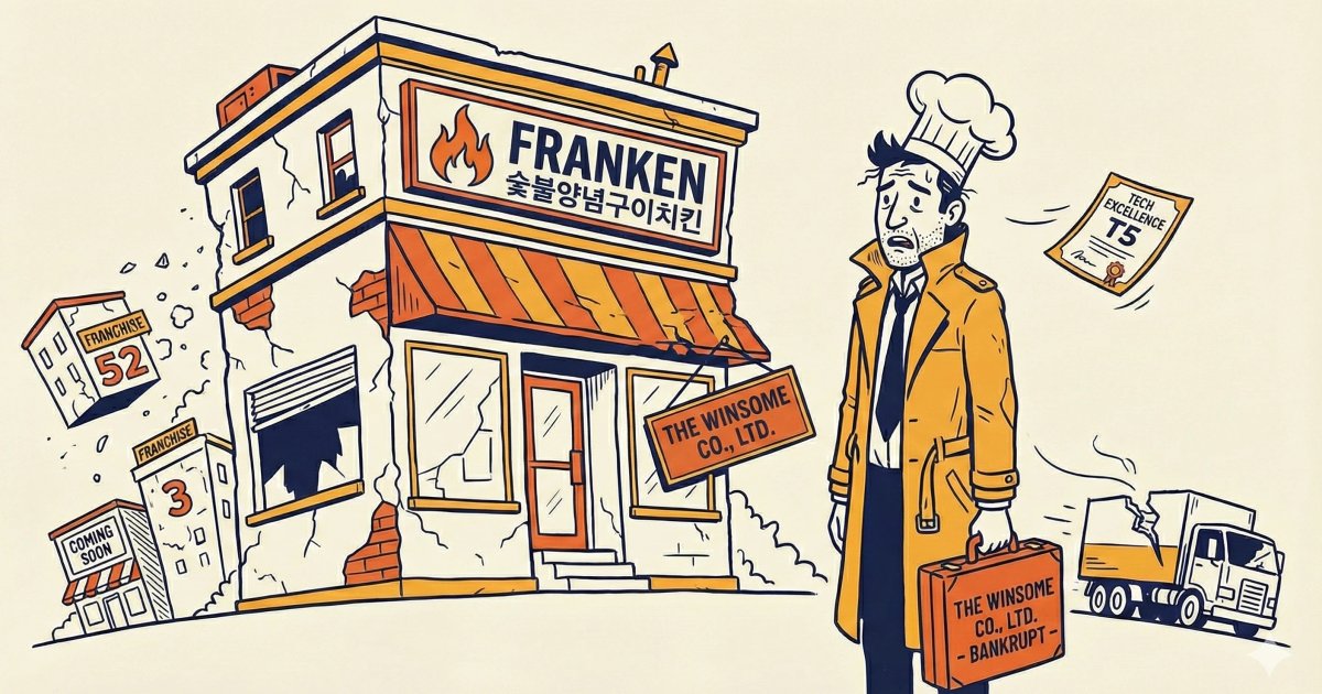 치킨 프랜차이즈 '프랑킨숯불양념구이치킨'을 운영해 온 주식회사 더윈썸이 법원으로부터 파산을 선고받았다. 21년 자본금 5천만원으로 설립되어 22년 매출 26억을 시작으로 24년 32억에 영업이익 1.3억을 내기도 했다.