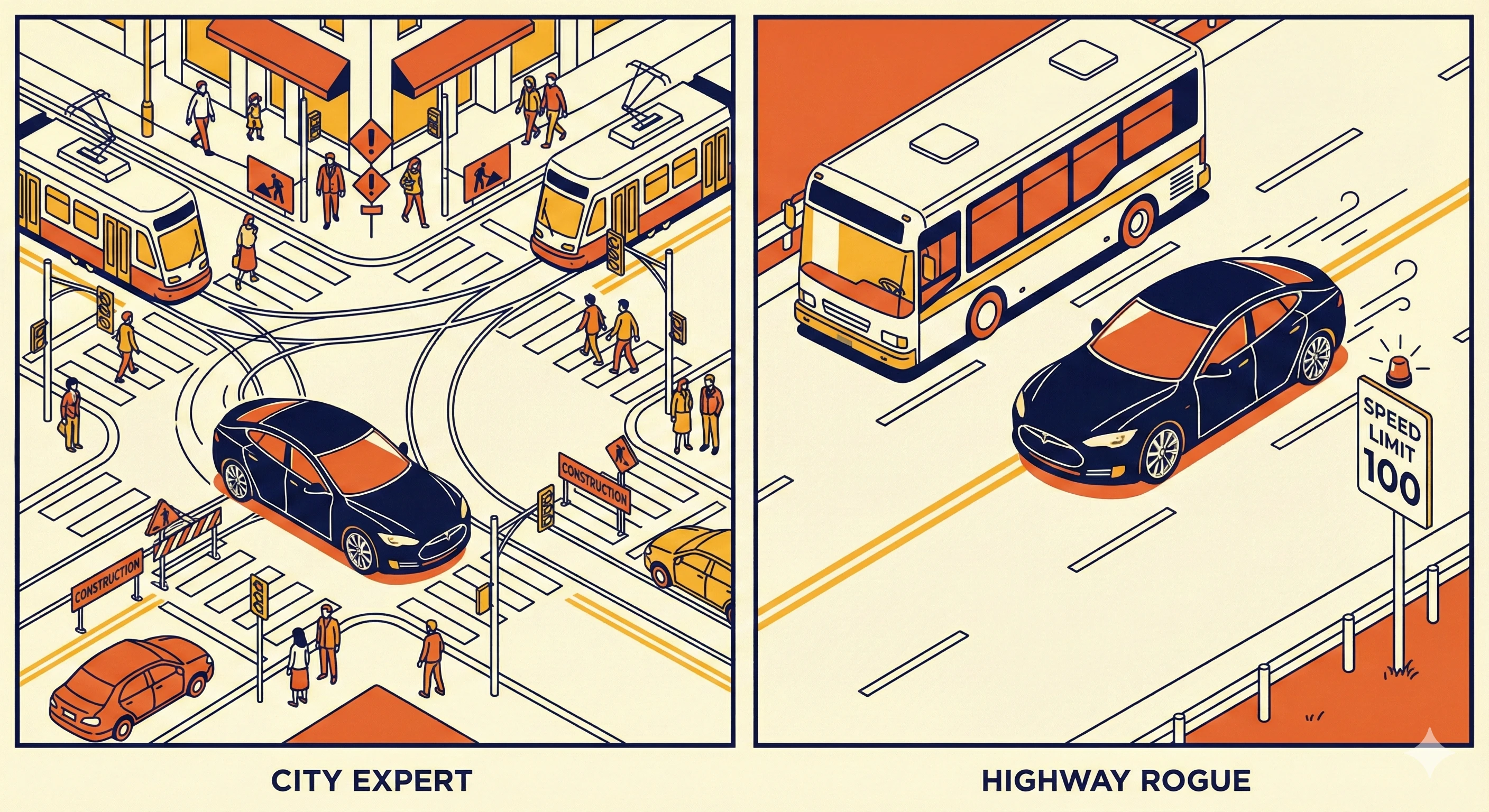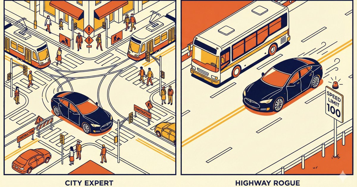 ◇ 시내 주행: "사람보다 낫다"… 공사 현장도 능숙하게 통과 가장 돋보이는 성과는 시내 주행 능력이었다. 보고서는 테슬라 FSD가 비보호 좌회전과 같이 고난도 판단이 필요한 구간을 제외하면, 전 구간에서 "일반 운전자 이상의 수준"으로 자율주행을 수행했다고 평가했다.