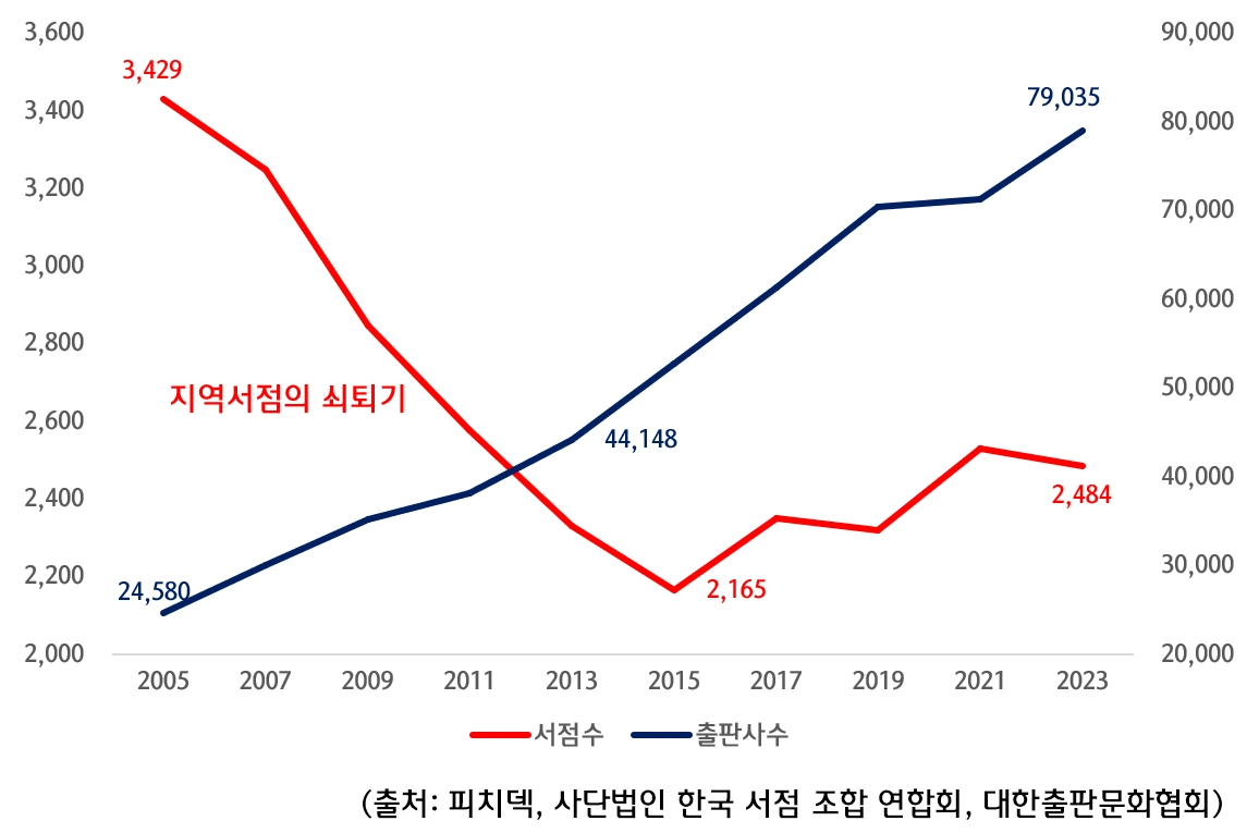 대한출판문화협회의 '2024년 출판시장 통계 보고서'에 따르면 2023년 성인 독서 인구 비율은 48.5%로 절반에도 미치지 못한다. 독서 인구 감소와 유통망 붕괴가 맞물리며 지역 서점은 자취를 감추고 있다.
