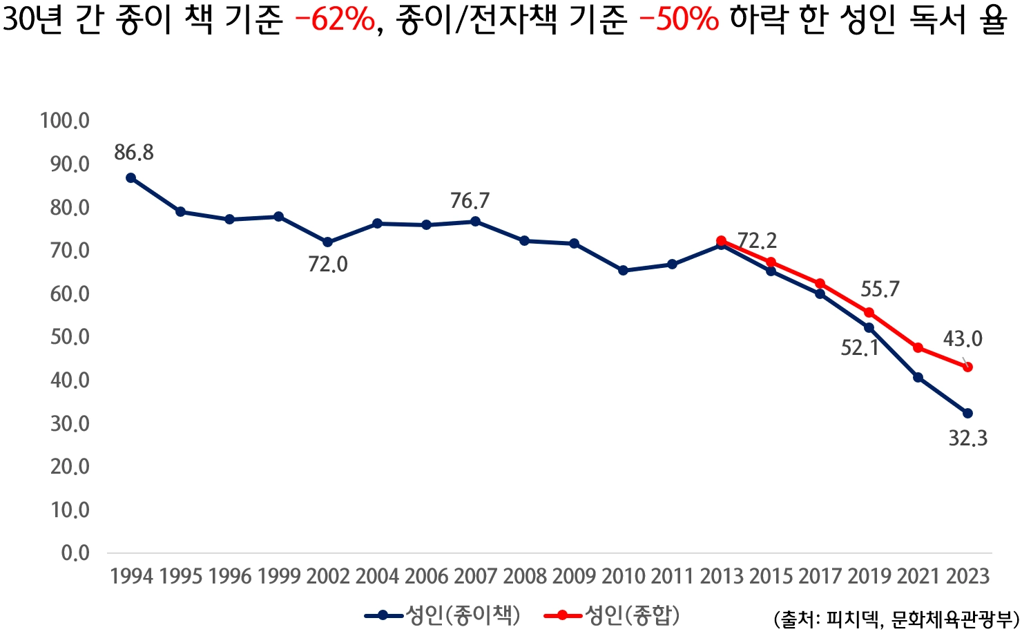 시각적 자극과 즉각적인 도파민을 제공하는 '스낵 컬처(Snack Culture)'가 여가 시간을 장악하면서, 긴 호흡과 능동적인 사유가 필요한 독서는 후순위로 밀려났다. 대한출판문화협회의 '2024년 출판시장 통계'에 따르면 2023년 성인 연간 종합 독서율은 48.5%에 불과하다. 국민 절반 이상이 1년에 책을 한 권도 읽지 않는 시대, 시장의 파이 자체가 쪼그라든 것이다.