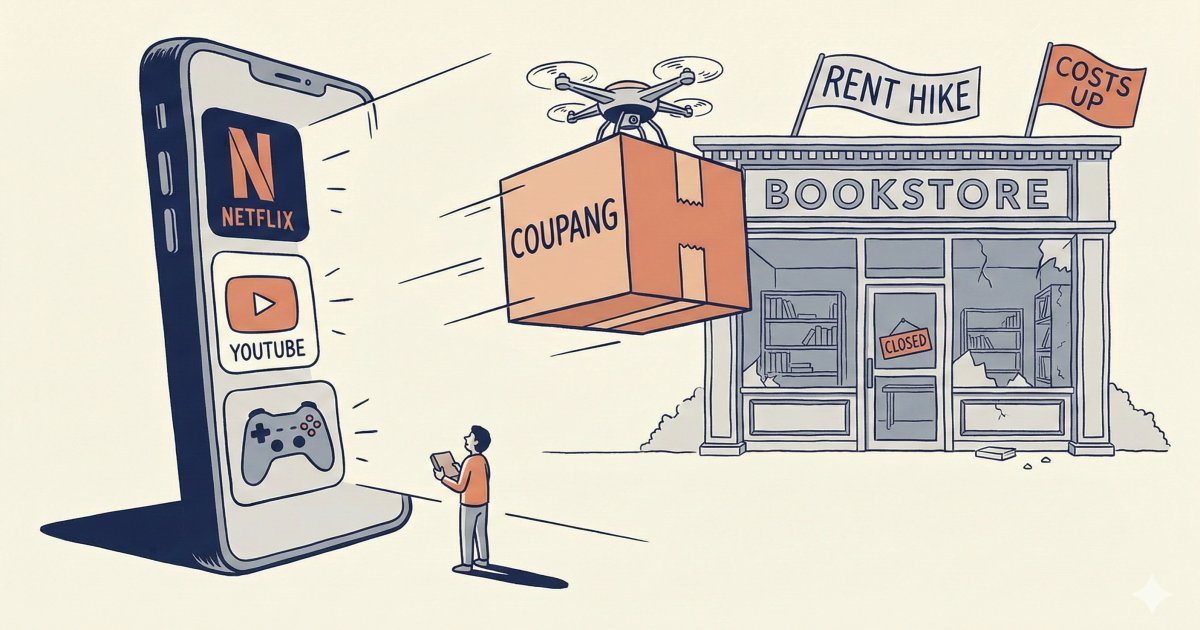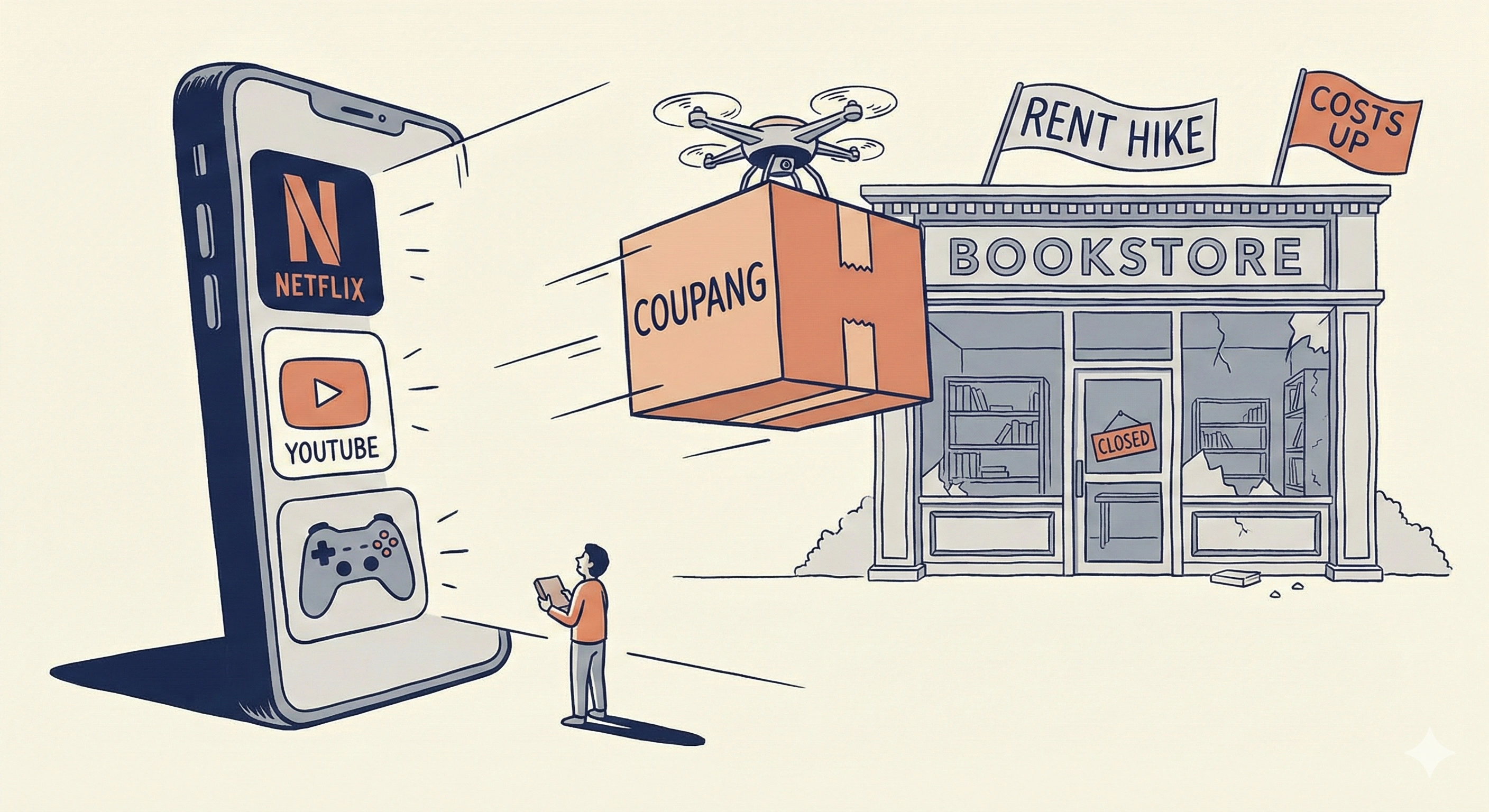 더 근본적인 문제는 수요의 실종이다. "책을 사지 않는 것"보다 무서운 건 "책을 읽지 않는 것"이다. 서점의 경쟁자는 더 이상 인근의 다른 서점이 아니라, 현대인의 시간을 독점하고 있는 넷플릭스, 유튜브, 웹툰 등 디지털 플랫폼이다.