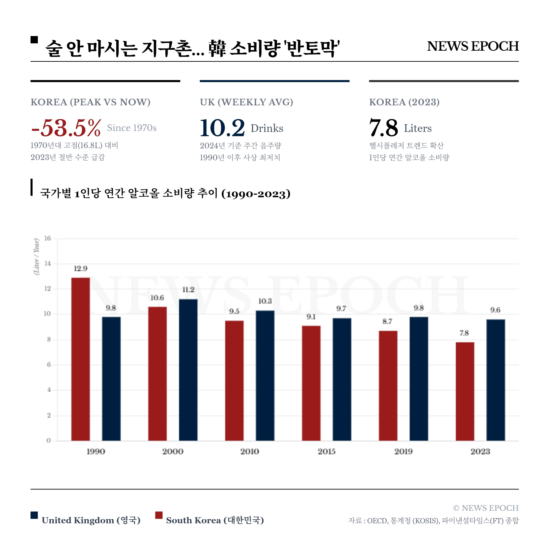 한국의 상황도 이와 궤를 같이한다. 통계청과 OECD(경제협력개발기구) 제공 자료에 따르면, 한국의 15세 이상 인구 1인당 연간 알코올 소비량은 1970년대 고도 성장기 당시 최대 16.8리터에 달했으나, 2023년에는 7.8리터 수준까지 떨어졌다. 과거 "부어라 마셔라" 하던 음주 문화가 사라지고, '즐겁게 건강을 관리한다'는 헬시플레저(Healthy Pleasure) 트렌드가 확산된 영향으로 풀이된다.