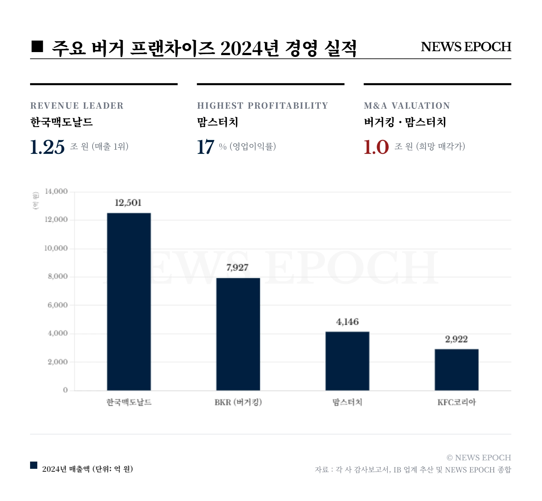 한국맥도날드: 매출 규모로는 업계 최상위권이다. 2021년 8,678억 원에서 2024년 1조 2,501억 원까지 매출이 껑충 뛰었다. 영업이익률은 수년째 마이너스(-1.8%~-3.2%)를 기록하다 2024년 0.9%로 영업이익 기준 흑자 전환하였지만 여전히 수익성 개선이 과제로 남았다. 최근 카타르 기업 '카말 알 마나'가 전략적 파트너(운영권 인수)로 선정되며 새로운 국면을 맞았다.