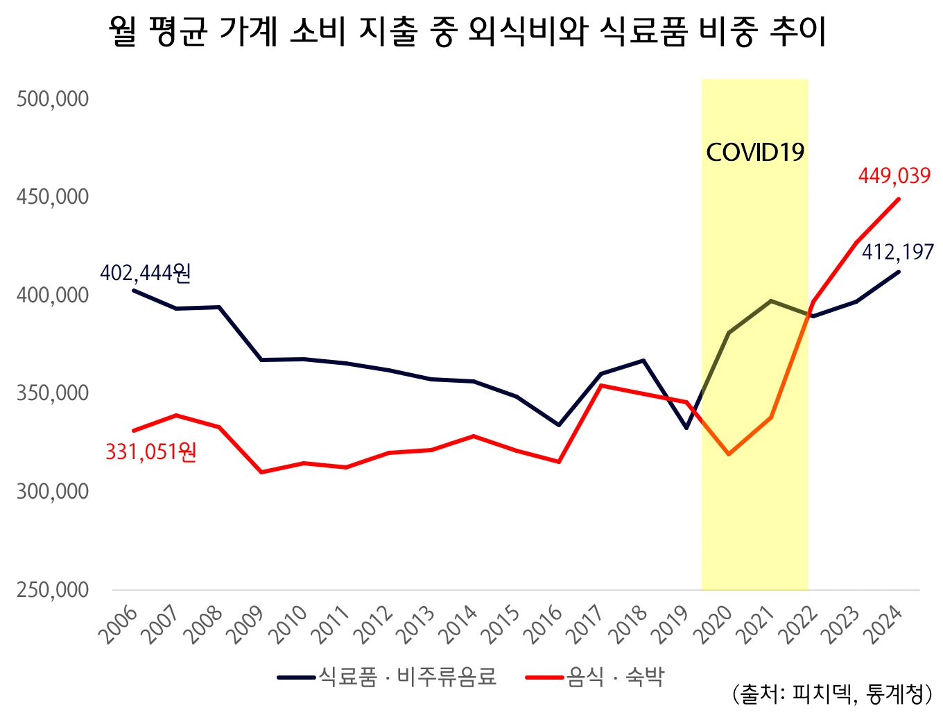 햄버거 시장 성장의 구조적 배경에는 '1인 가구의 폭발적 증가'가 있다. 통계청에 따르면 1인 가구는 2015년 520만 가구에서 2023년 약 782만 가구로 50%나 급증했다. 반면 4인 이상 가구는 23% 감소했다. 혼자서 간편하게 식사를 해결하려는 1인 가구의 증가는 햄버거 수요의 강력한 지지 기반이 되고 있다. 여기에 월 평균 가계 소비 지출 중 외식비와 식료품 비중이 코로나 시기에 역전 되었다.