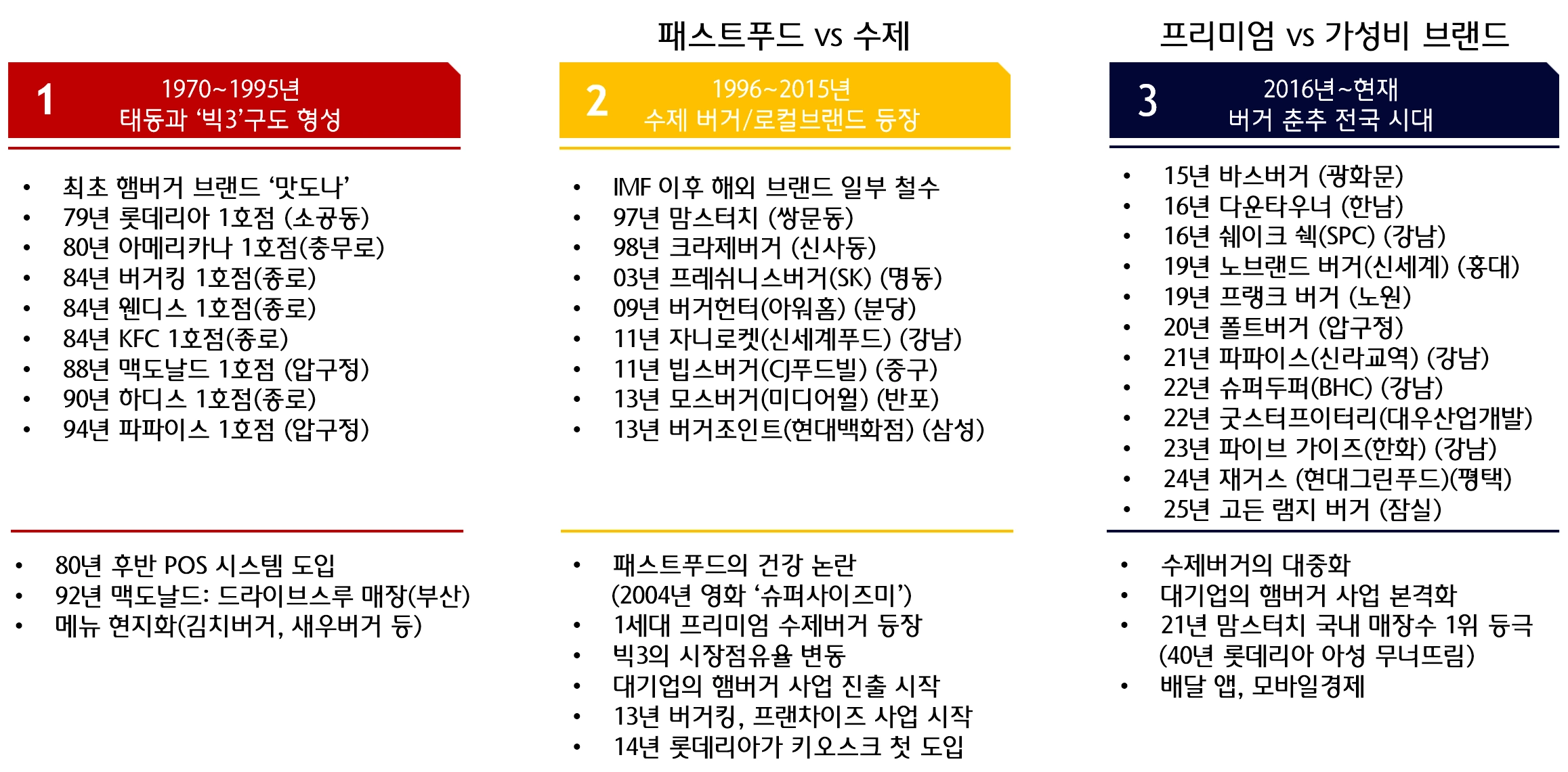 ① 태동과 '빅3' 구도 형성 (1970~1995년): 1979년 롯데리아 1호점(소공동)을 시작으로 1984년 버거킹과 KFC, 1988년 맥도날드가 상륙하며 패스트푸드 전성시대를 열었다. 이 시기 '빅3(롯데리아, 맥도날드, 버거킹)'가 시장을 주도했다.