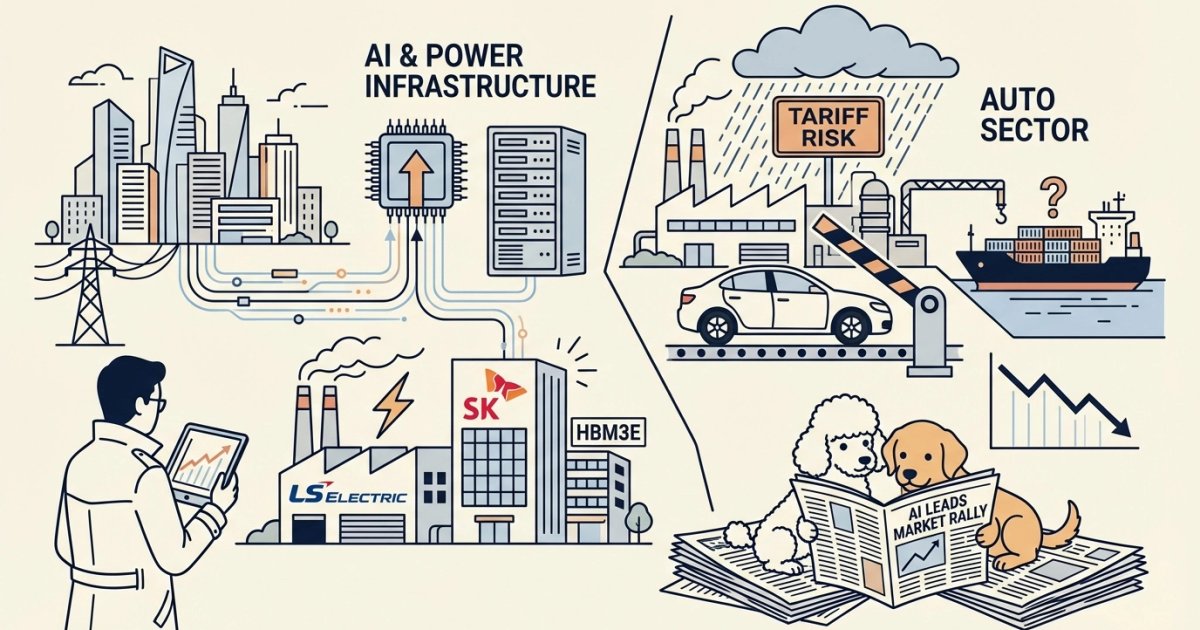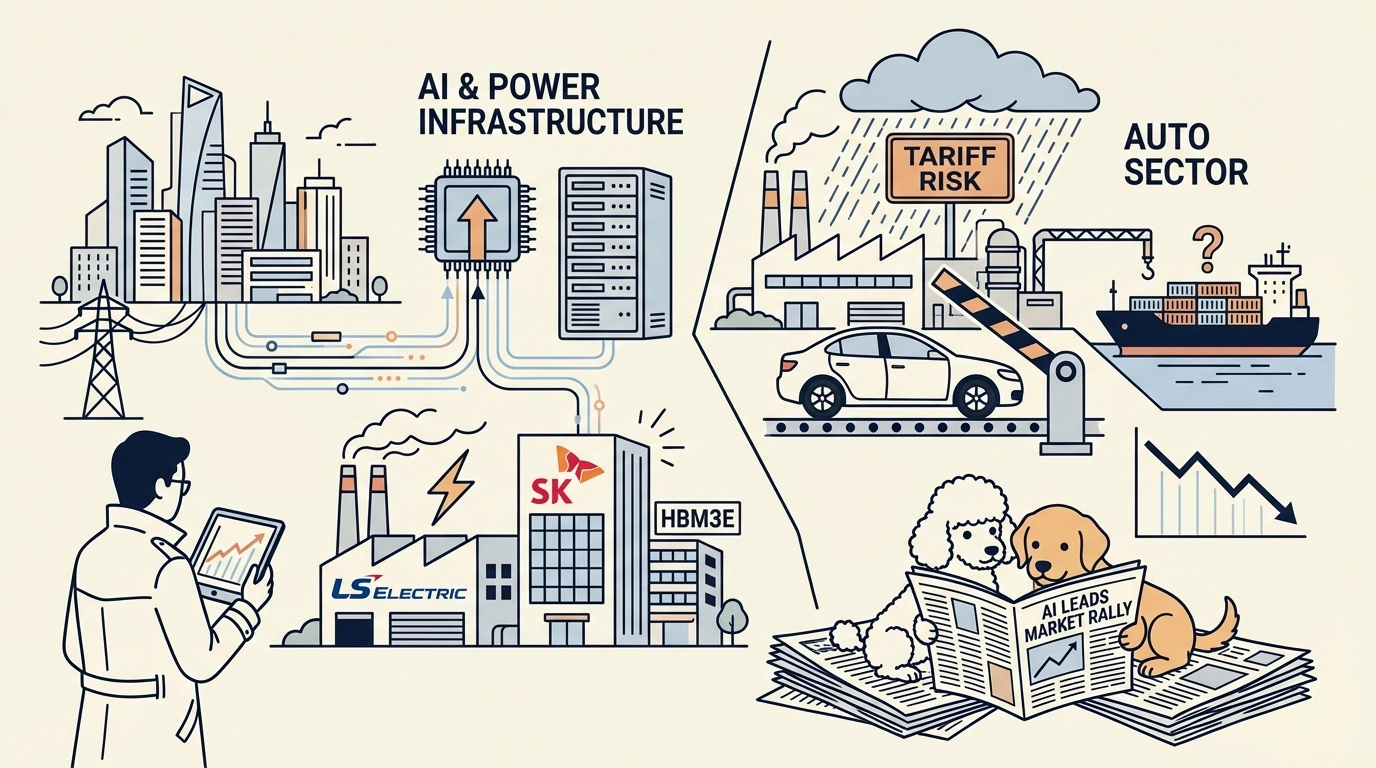 시장은 실적이 확인되는 기술주(AI·전력)와 매크로 변수에 취약한 전통 제조(자동차) 간의 디커플링(탈동조화)이 뚜렷하다. 경기 둔화 시그널에도 불구하고 AI 반도체와 전력 인프라 섹터는 강력한 이익 성장성을 바탕으로 밸류에이션 확장을 지속하고 있다.