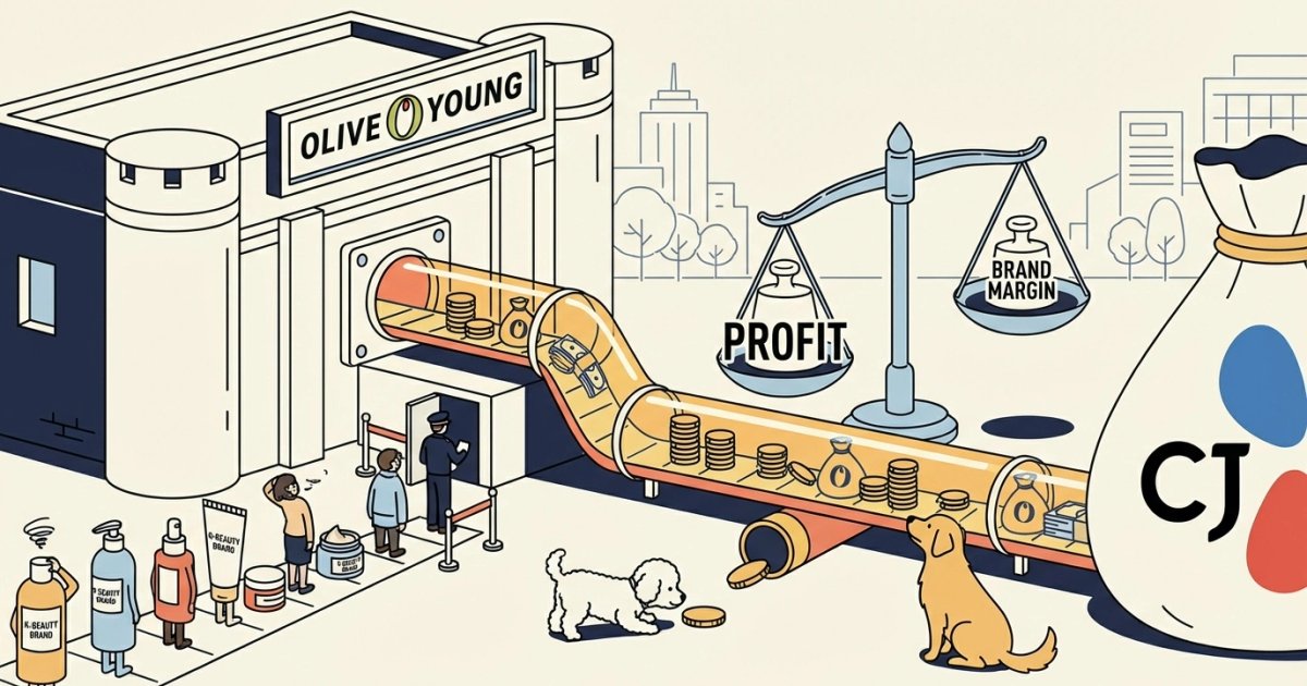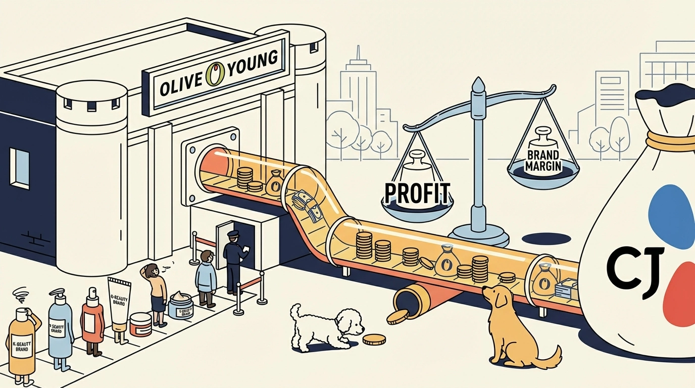 "매출의 절반을 떼어줘도 올리브영 매대만 잡을 수 있다면 남는 장사다." K-뷰티 브랜드 관계자들의 이 푸념 섞인 목소리는 현재 뷰티 시장의 권력이 어디에 쏠려 있는지를 상징적으로 보여준다. CJ올리브영은 2024년 매출 4.8조 원, 영업이익 6,076억 원이라는 역대급 실적을 갈아치웠다. 1편에서 다룬 어뮤즈가 2.9%의 영업이익률로 고군분투할 때, 유통사인 올리브영은 그 4배가 넘는 12.7%를 남겼다. 재주는 브랜드가 넘고, 실속은 유통사가 챙기는 이 수익 구조는 이제 산업의 표준이 되었다.