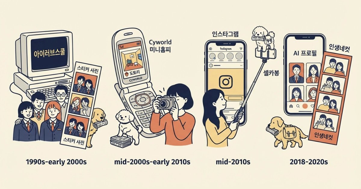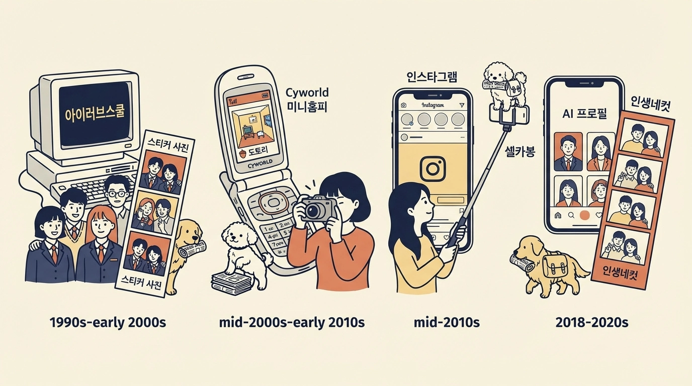 주요 트렌드: 싸이월드 미니홈피(2001), 디카 대중화(2000), PC 사진보정(2006)