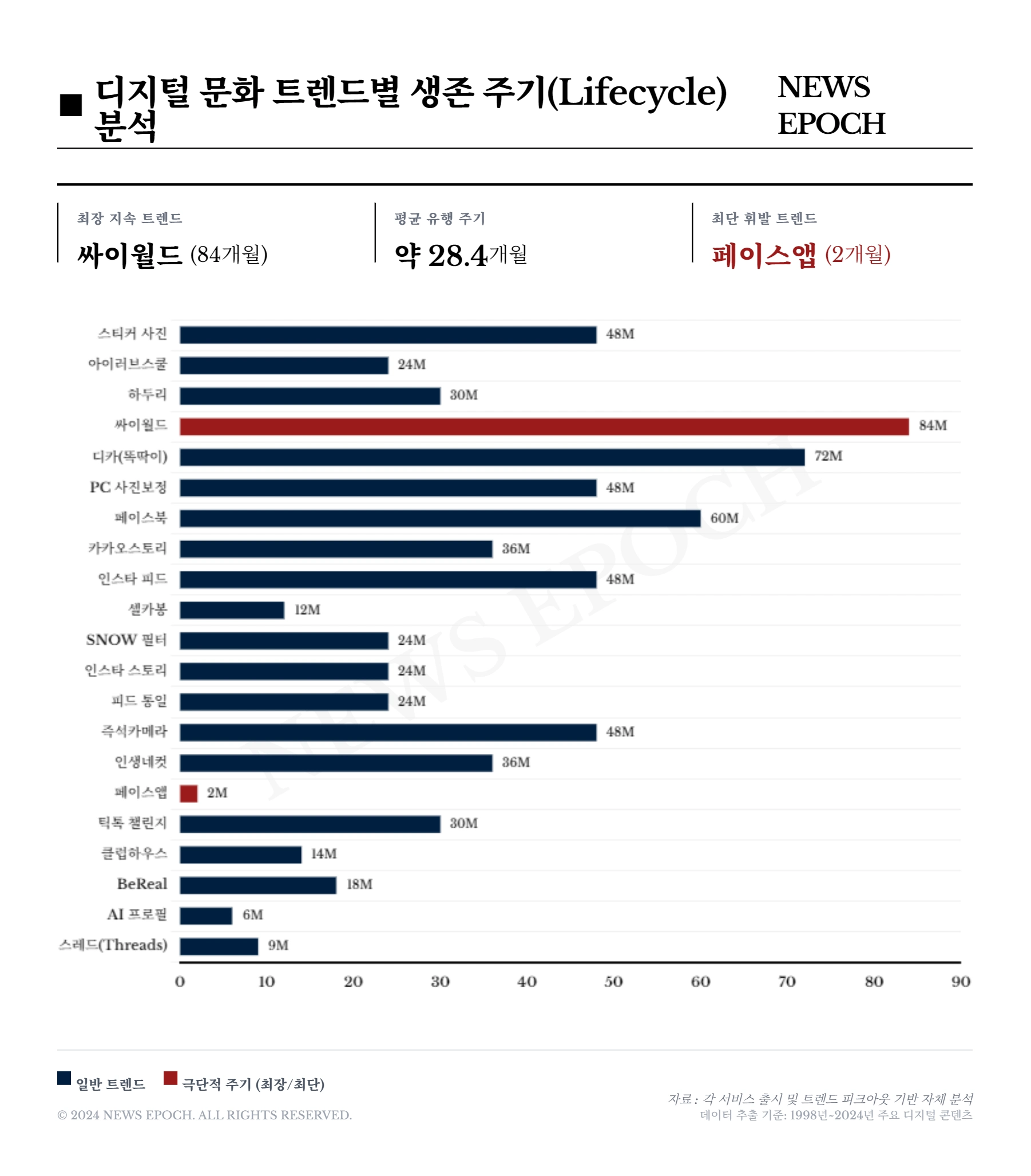 반면, 코로나19 팬데믹은 디지털 트렌드의 변화 속도를 비정상적으로 가속화했다. 대면 접촉이 금지되자 틱톡을 필두로 한 숏폼 챌린지가 30개월간 폭발하며 미디어 소비 구조를 바꿨고, 목소리로만 소통하는 클럽하우스는 인간 외로움을 파고들며 14개월간 화제를 모았다. 이후 등장한 AI 프로필과 AI 아바타는 단 6개월 만에 피크를 찍으며, 이제 기술이 인간의 정체성마저 재창조하는 단계에 이르렀음을 시사한다.