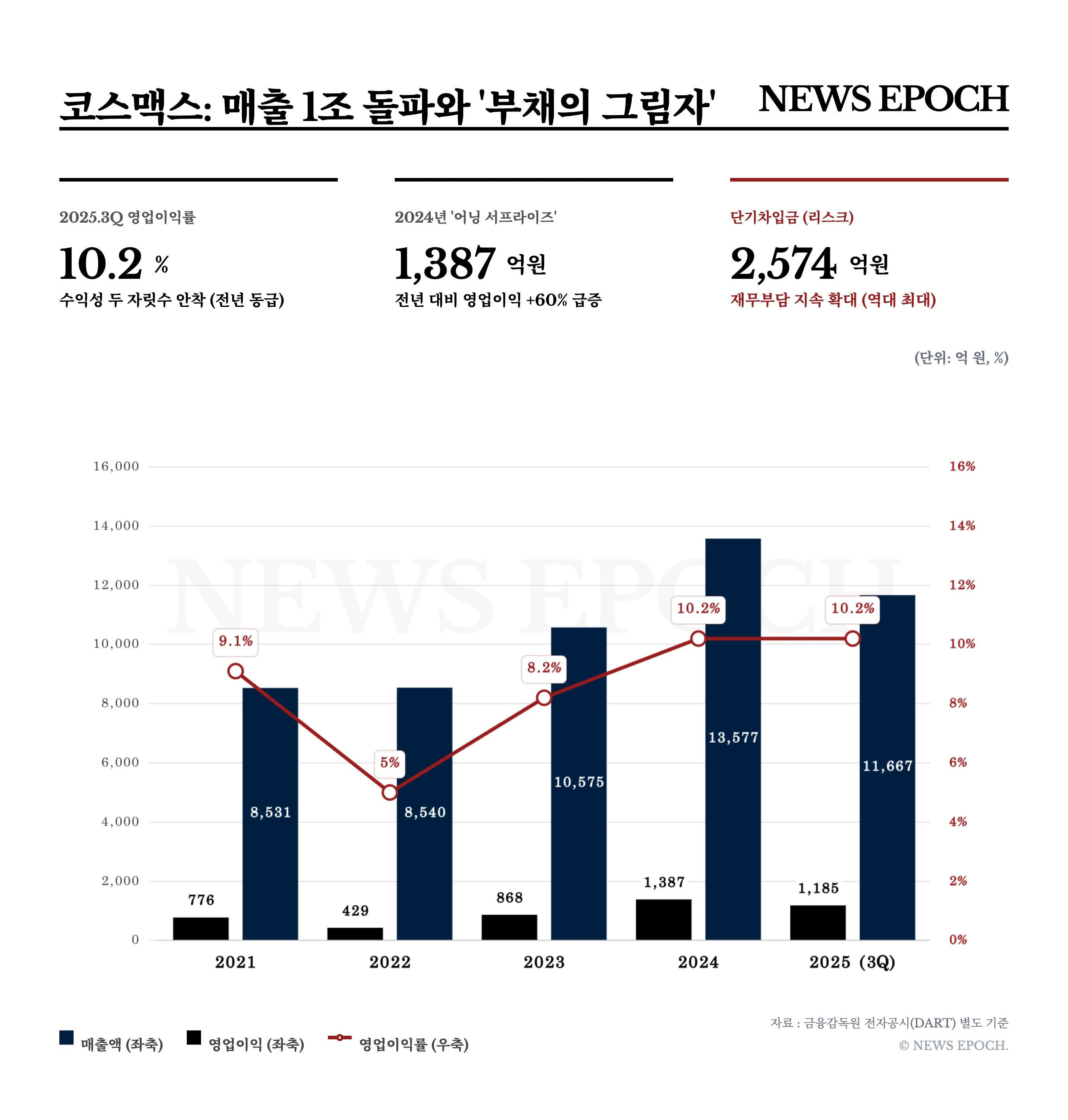결국 코스맥스가 단기차입금을 2,574억 원(+522억 원)까지 늘린 것은, 단순한 유동성 위기가 아니라 압도적 시장 점유율을 유지하기 위해 치러야 할 '운영 비용'을 감내하는 구간으로 해석된다. 시장이 코스맥스의 외형 성장보다 향후 '마진율 회복'과 '이익 체력' 확인에 더 주목하는 이유도 바로 이 때문이다.