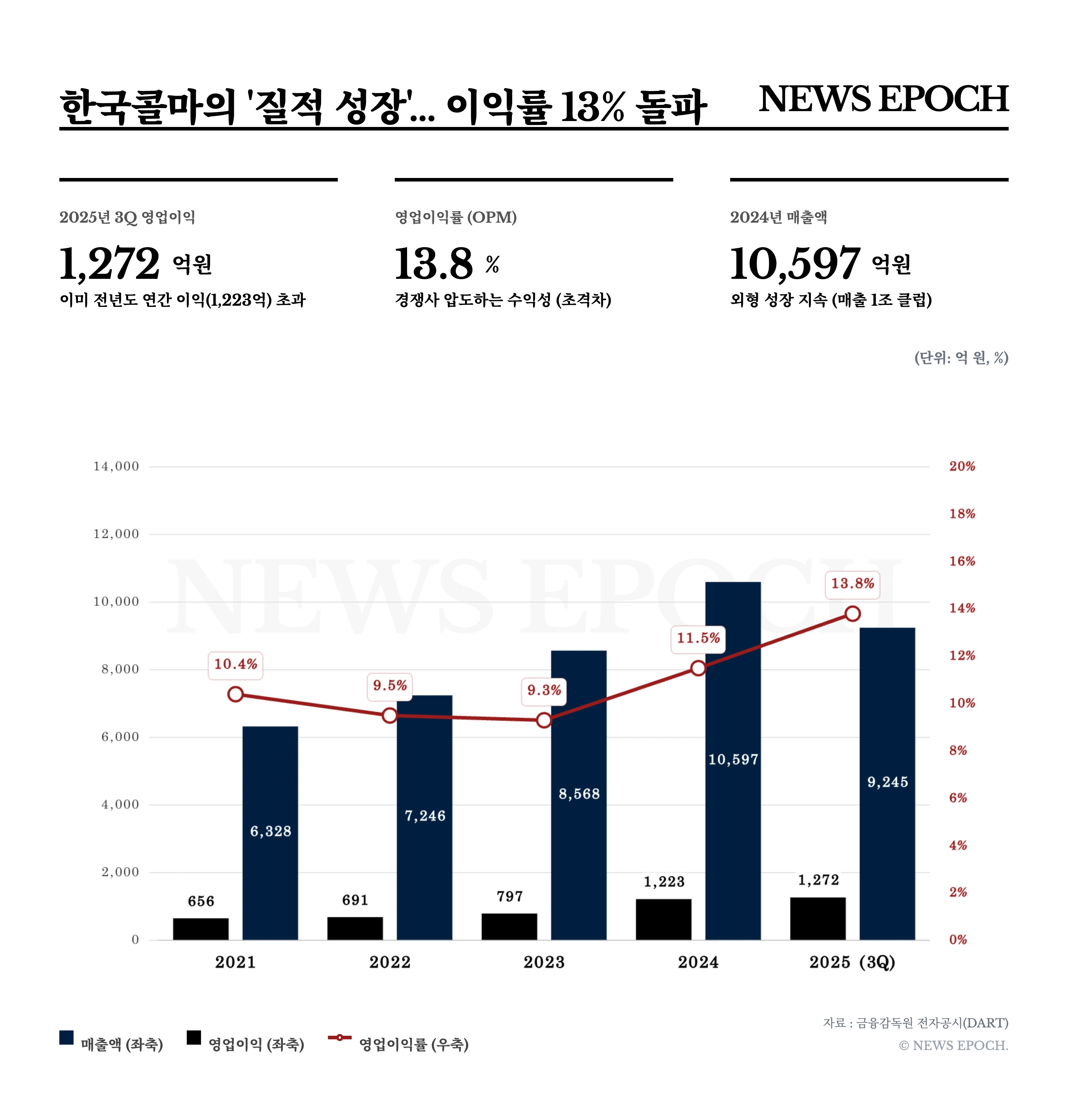 그러나 전례 없는 호황기 속에서도 업계 1위와 2위는 서로 다른 전략적 선택을 마주했다. 똑같은 슈퍼 사이클을 통과하면서도 한쪽은 과감한 차입을 통해 팽창하는 시장 점유율을 방어했고, 다른 한쪽은 압도적인 수익성을 바탕으로 미래 밸류체인 선점에 집중했다. 매출 1조 3천억 원을 달성한 코스맥스와 영업이익률 13.8%를 기록한 한국콜마. 역대급 호황 속, 서로 다른 성장 전략을 택한 두 기업의 재무 상황을 점검한다.