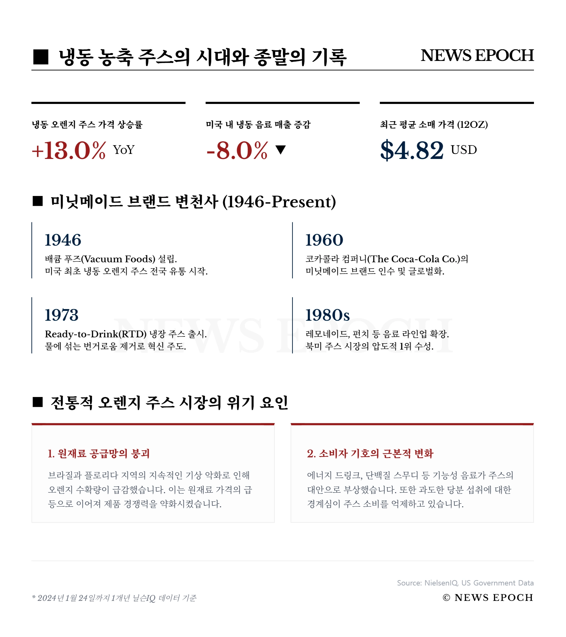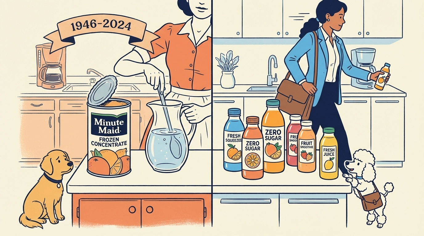글로벌 음료 제조사 코카콜라가 80년 역사의 ‘미닛메이드 냉동 농축 주스’ 생산을 전격 중단한다. 1946년 출시 이후 미국 가정의 아침 식탁을 상징해 온 이 제품의 퇴장은 단순한 품목 정리를 넘어, 원재료 수급난과 ‘설탕 혐오’로 대변되는 건강 중심의 소비 패러다임 변화를 극명하게 보여주고 있다.
