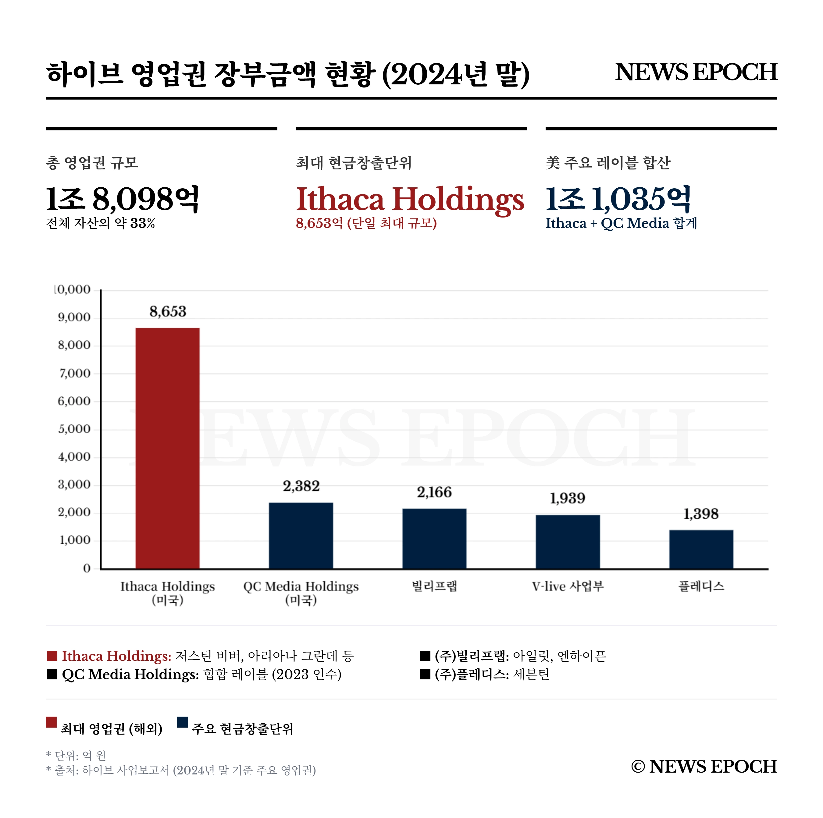 재무상태표에서 가장 큰 비중을 차지하는 항목은 약 1조 8,098억 원에 달하는 '영업권'이다. 영업권은 하이브가 이타카 홀딩스(Ithaca Holdings), QC미디어 등 다른 기업을 인수할 때 피인수 기업의 순자산 가치보다 추가로 지불한 경영권 프리미엄을 뜻한다. 이는 2024년 말 기준 하이브 전체 자산(약 5.4조 원)의 약 33%를 차지하는 규모다.