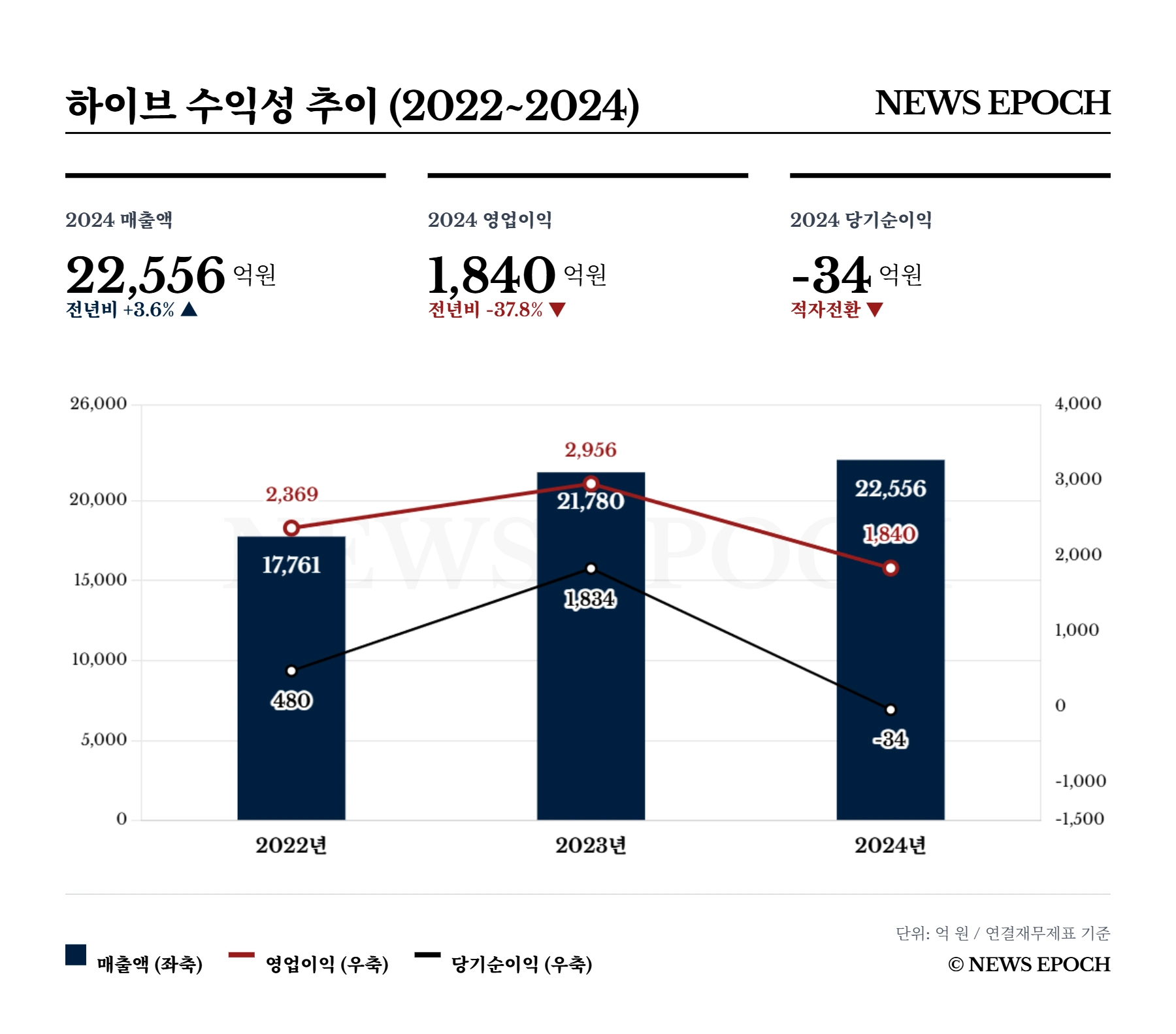 하이브는 2024년 연결 기준 매출액 2조 2,556억 원으로 역대 최대치를 경신했으나, 영업이익은 전년 대비 37.8% 감소했고 당기순이익은 -34억 원을 기록하며 적자로 전환했다 . 이는 M&A 이후 발생한 무형자산 상각 비용과 해외 자회사의 손실이 반영된 결과다.