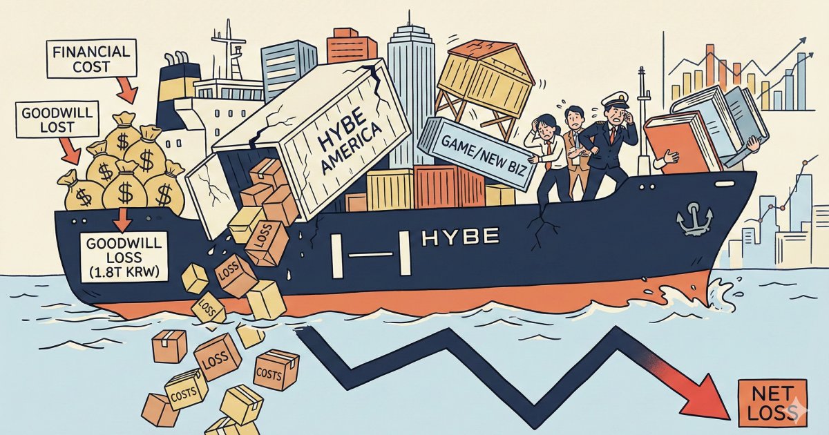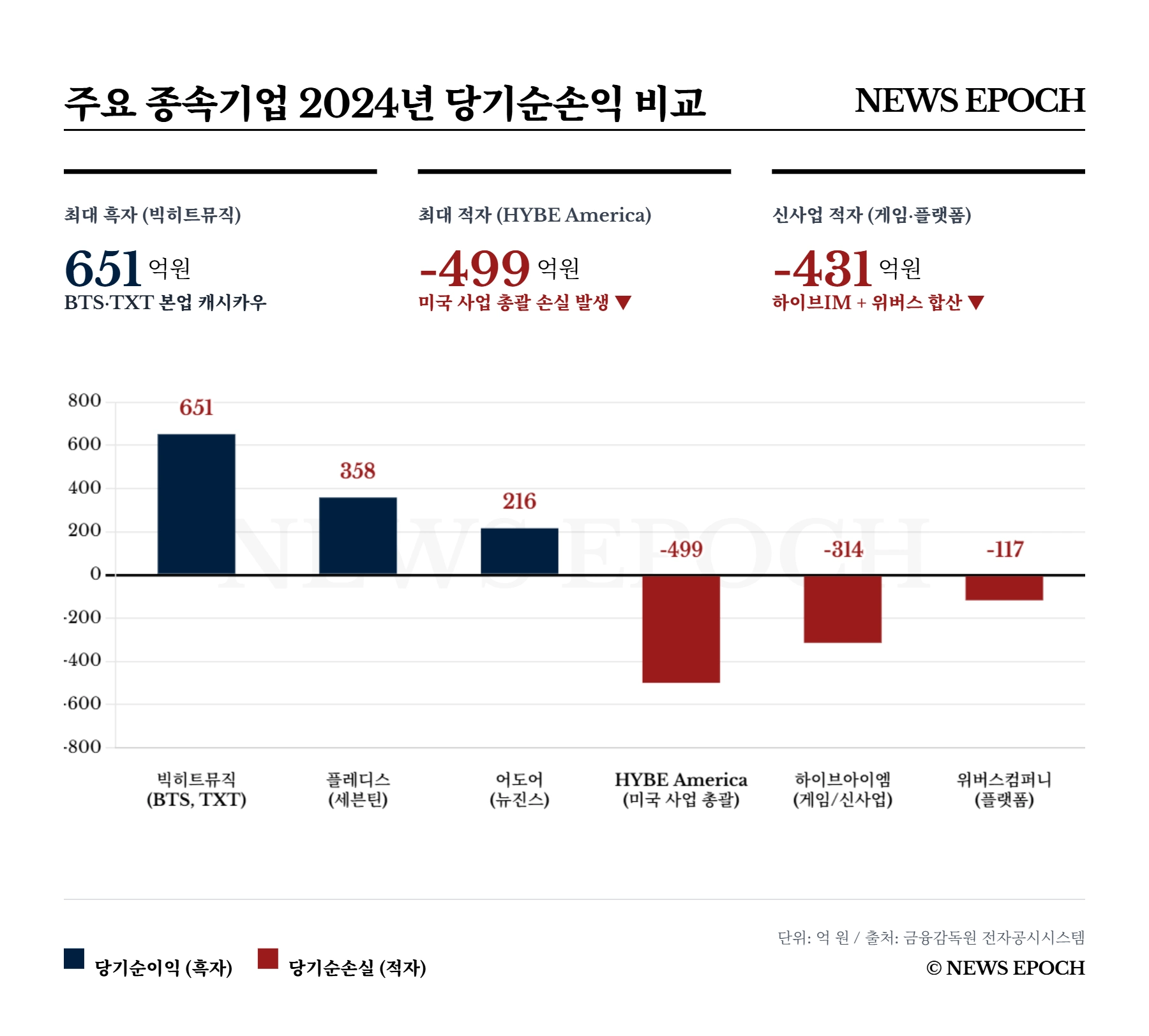 더불어 게임 퍼블리싱 등 신사업을 담당하는 하이브아이엠(HYBE IM)이 약 277억 원의 순손실을 기록했고, 플랫폼 운영사인 위버스컴퍼니도 약 107억 원의 적자를 냈다. 반면, 방탄소년단(BTS)과 투모로우바이투게더가 소속된 빅히트뮤직이 895억 원, 세븐틴이 소속된 플레디스가 663억 원의 순이익을 창출했다. 결과적으로 국내 핵심 음악 레이블들이 창출한 이익을 미국 법인과 신사업 부문의 누적 적자가 상쇄하는 구조적 불균형이 이어지고 있다.