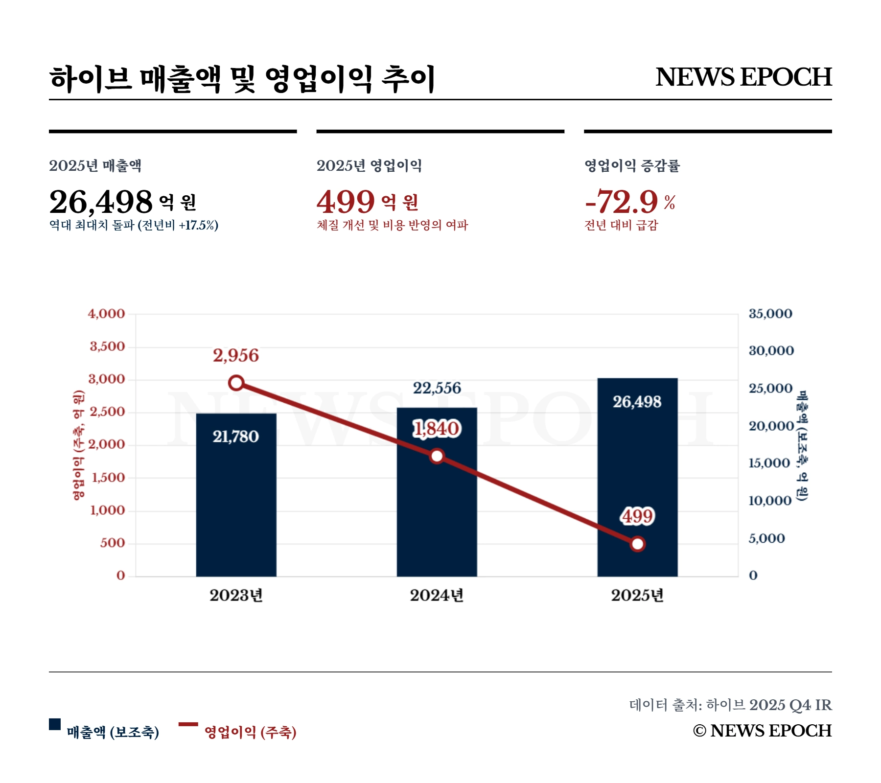 하이브의 2025년 실적은 외형 성장과 수익성 하락이 동시에 나타나는 구조적 특징을 보였다. 하이브의 2025년 연간 누적 매출액은 2조 6,498억 원으로 전년 대비 17.5% 증가하며 역대 최대치를 경신했으나, 연간 영업이익은 499억 원으로 전년 대비 72.9% 급감했다.