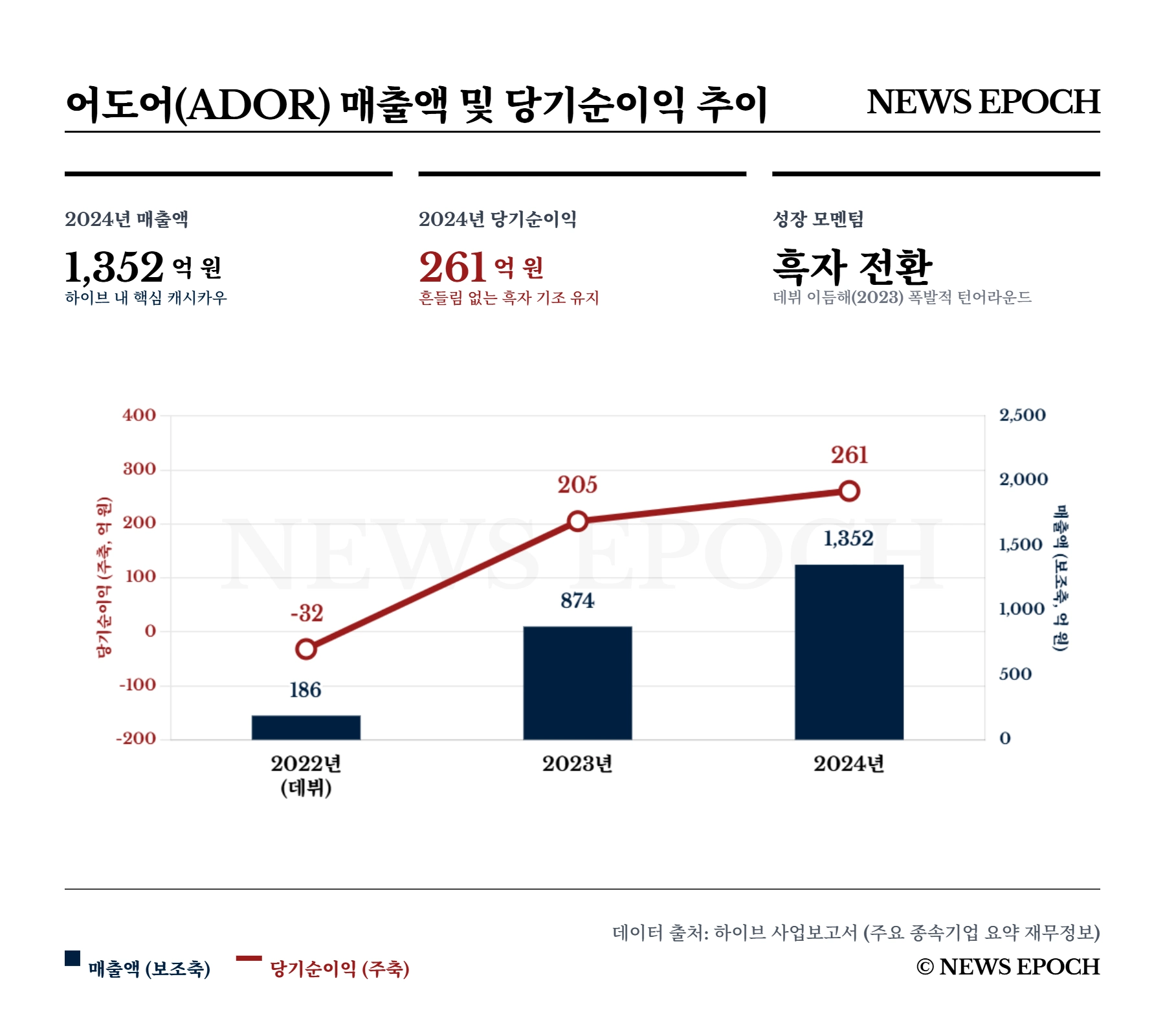 더불어 기업가치에 중대한 영향을 미치는 자회사 어도어(ADOR) 소속 그룹 뉴진스의 완전체 활동 여부 역시 2026년 현재까지도 마침표를 찍지 못했다. 어도어는 2024년 기준 매출액 1,352억 원, 당기순이익 261억 원을 기록하며 하이브 내 핵심 캐시카우로 자리 잡은 상태다. 지난해 10월 법원이 전속계약 유효 판결을 내리고 뉴진스 멤버들이 항소를 포기하면서 이들은 하이브로 복귀했다. 그러나 어도어 측이 멤버 다니엘을 상대로 전속계약 해지를 통보하고 430억 원대의 손해배상 소송을 제기하면서 '5인 완전체' 활동은 불투명해졌다. 최근 풋옵션 소송 1심에서 승소한 민희진 전 대표가 "256억 원의 풋옵션을 포기할 테니 다니엘을 복귀시키라"고 제안했지만, 하이브 측은 풋옵션 패소에 항소하며 평행선을 달리고 있다. 이처럼 장기화 국면에 접어든 핵심 IP의 리스크 해소는 2026년 하이브가 직면한 가장 까다로운 과제로 남아있다.