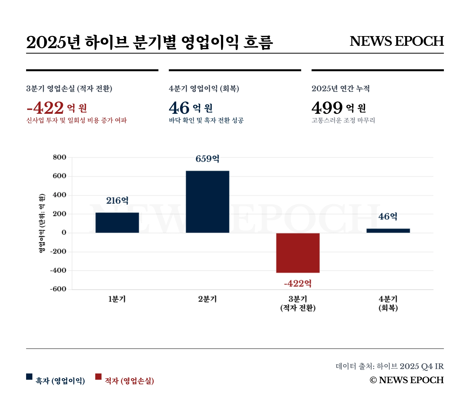 2024년 첫 순손실 전환을 겪은 하이브는 2025년 한 해 동안 비대해진 조직을 통폐합하는 등 비용 구조조정을 진행했다. 그 결과 2025년 4분기 본업인 영업이익 부문에서 흑자 전환을 이뤄냈으며, 동시에 연말 장부에는 잠재 부실을 일시에 털어내는 '빅배스(Big Bath)'를 단행해 향후 실적 불확실성을 해소했다. 2026년에는 방탄소년단(BTS) 완전체 투어를 중심으로 본업의 수익성을 극대화한다는 계획이다.