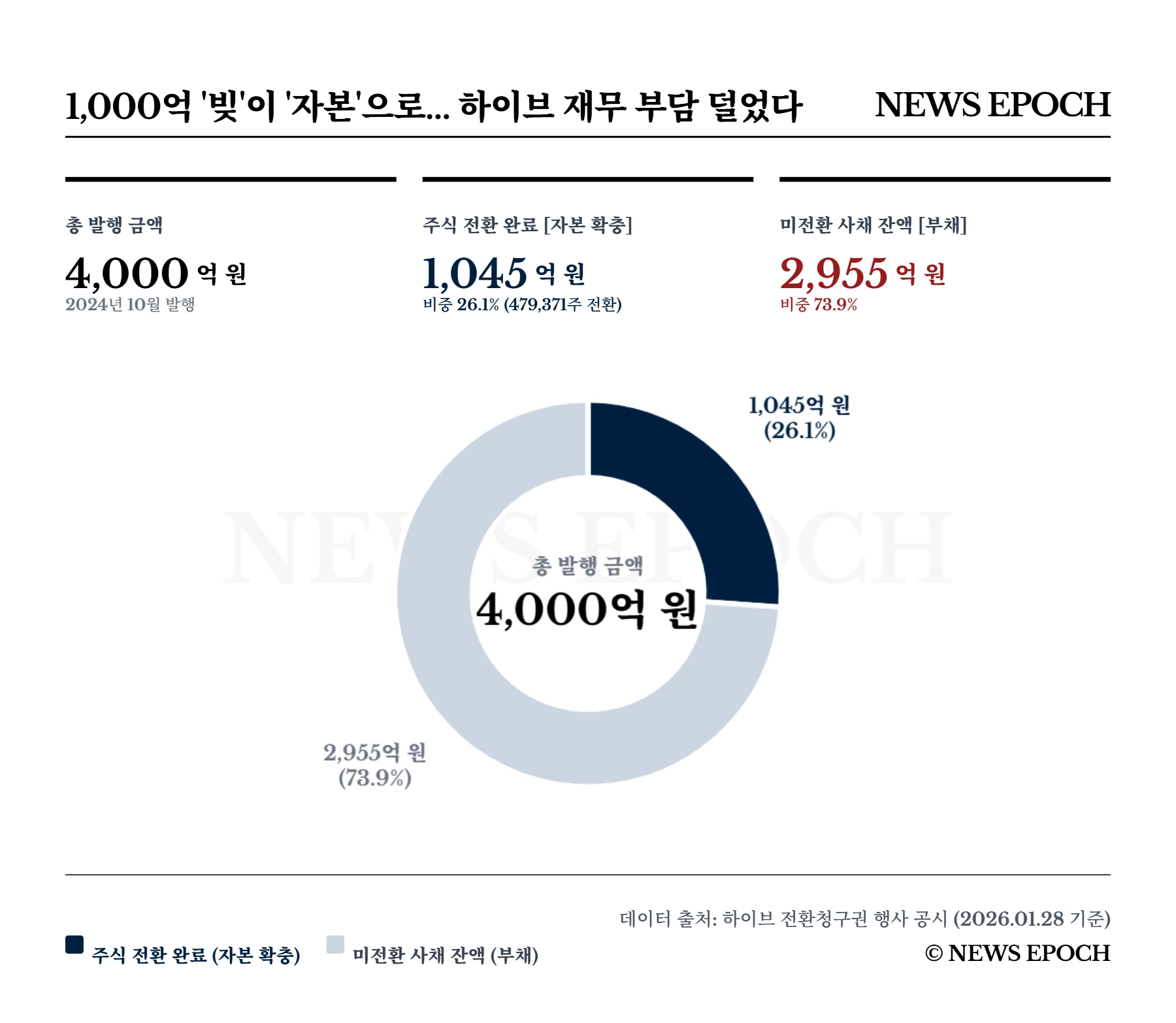이와 함께 재무구조를 획기적으로 개선하는 긍정적인 '자본 확충' 시그널도 나타났다. 2026년 1월 공시에 따르면, 하이브가 2024년 10월 발행했던 4,000억 원 규모의 제4회차 전환사채(CB) 중 약 1,000억 원 규모의 물량이 주식으로 전환 청구되었다. 막대한 빚(부채) 일부가 자본으로 대체됨에 따라 이자 비용 부담을 덜어내고 훼손되었던 재무 건전성을 빠르게 안정화하는 데 성공했다. 투자자들이 원금 회수 대신 주식 전환을 택한 것은 2026년 실적 반등에 대한 자본 시장의 긍정적인 전망을 보여준다.