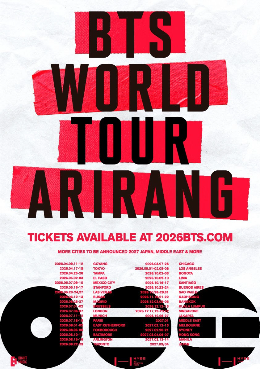 하이브의 2025년 4분기 IR 자료에 따르면, 방탄소년단은 2026년 4월 9일과 11~12일 한국 고양시를 시작으로 대규모 월드투어 'BTS WORLD TOUR ARIRANG'을 개최한다. 이번 투어는 전 세계 23개국, 34개 도시에서 총 82회 규모로 진행된다 . 도쿄, 라스베이거스 등 기존 주요 거점은 물론 마드리드, 뮌헨, 보고타, 리마, 부에노스아이레스 등 14개 신규 도시에 최초로 진입하며 글로벌 팬덤 저변을 비약적으로 확장할 예정이다.
