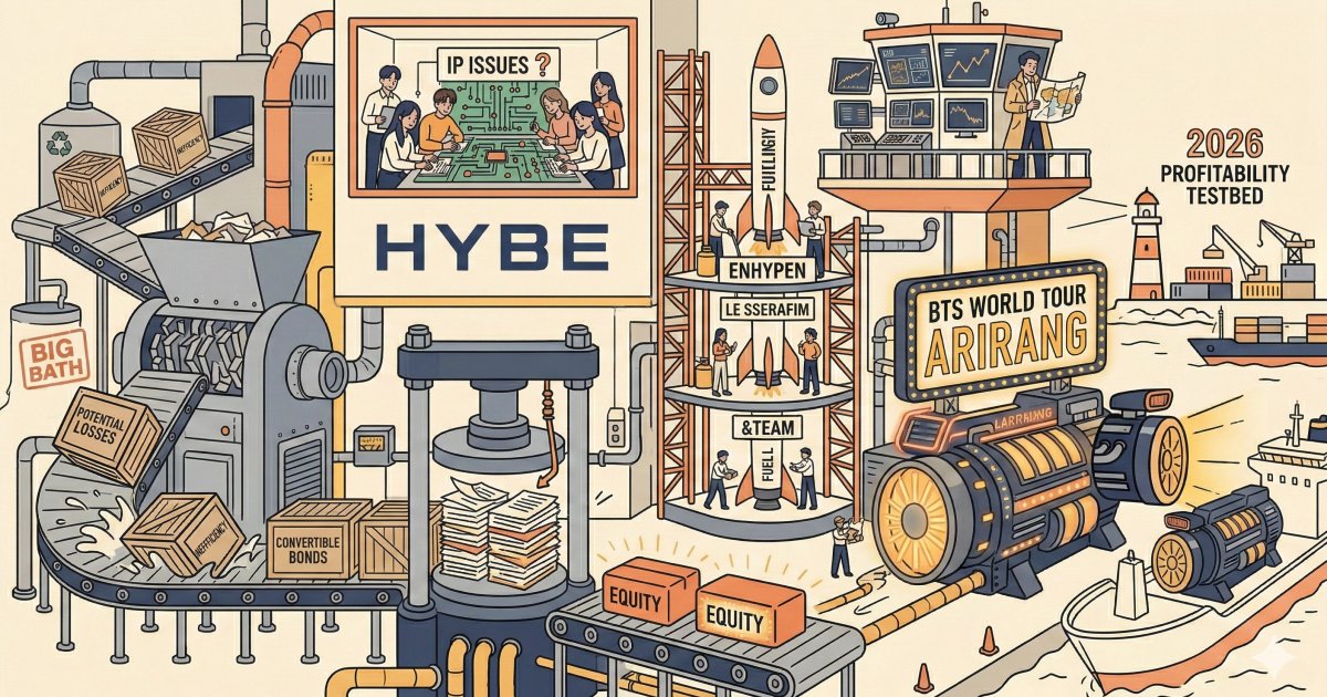 공격적인 M&A로 외형을 확장해 온 하이브는 수익성 둔화라는 과제에 직면하며 2025년 대대적인 체질 개선에 돌입했다. 본 기사에서는 실적 부진을 장부에 선제적으로 반영하며 재무 재편에 나선 2025년의 구조조정 과정과 2026년 수익성 정상화의 핵심 변수를 분석한다.