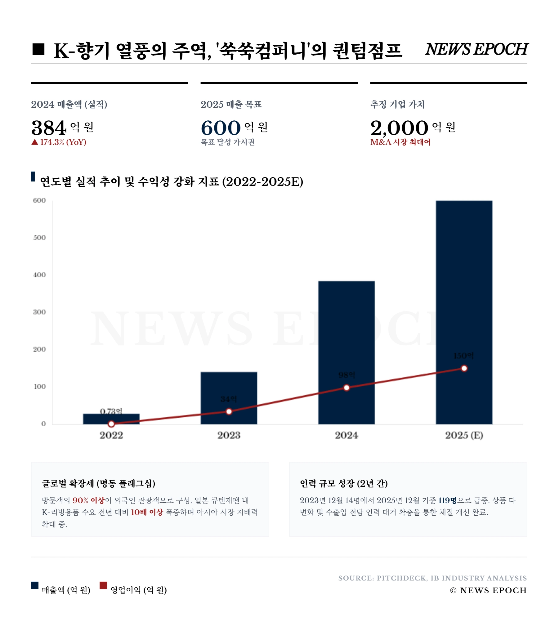 피치덱의 데이터에 따르면 실적 지표는 경이로운 수준이다. 2022년 매출 28억 원, 영업이익 7,300만 원이었던 실적은 2023년 매출 140억 원, 영업이익 34억 원으로 급등했다. 이어 2024년에는 매출 384억 원, 영업이익 98억 원을 기록하며 매년 수직 상승 중이며, 올해(2025년)는 매출 600억 원, 영업이익 150억 원을 목표로 하고 있다. 이러한 압도적인 흑자를 바탕으로 2023년에는 사옥용 건물을 매입한 것으로 추정되며, 직원 수 역시 2023년 12월 14명에서 단 2년 만인 2025년 12월 기준 119명까지 급증했다.