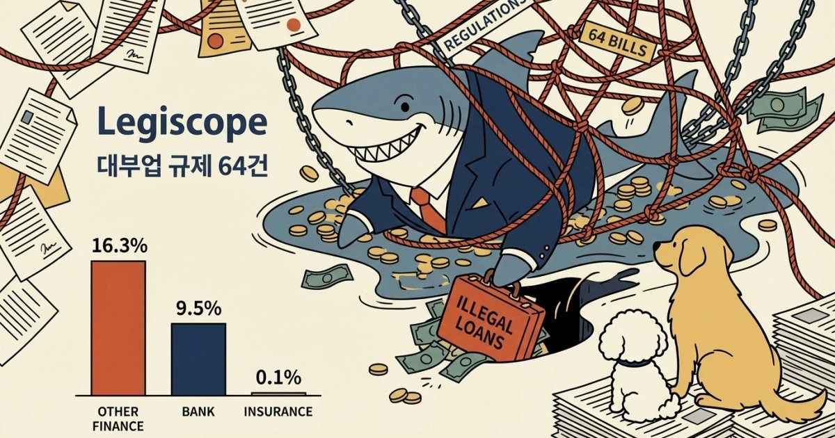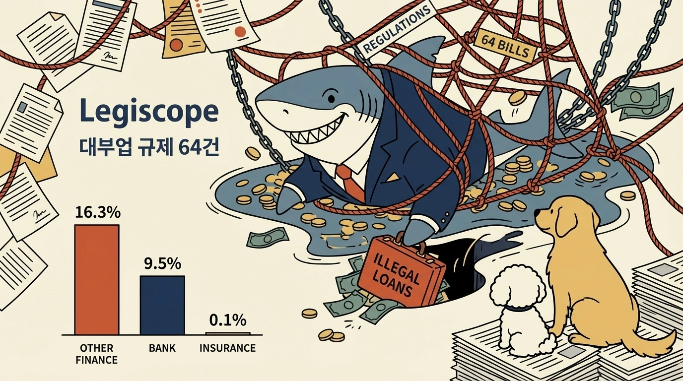 Legiscope 데이터 분석 결과 대부업이 포함된 기타금융 분야의 규제 비율은 16.3%로 금융권에서 가장 높은 수준이다. 은행·증권의 규제 비율이 9.5%인 것과 비교하면 상당히 높은 수치다. 보험업 규제 비율은 0.1%에 불과하다.