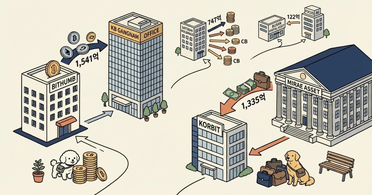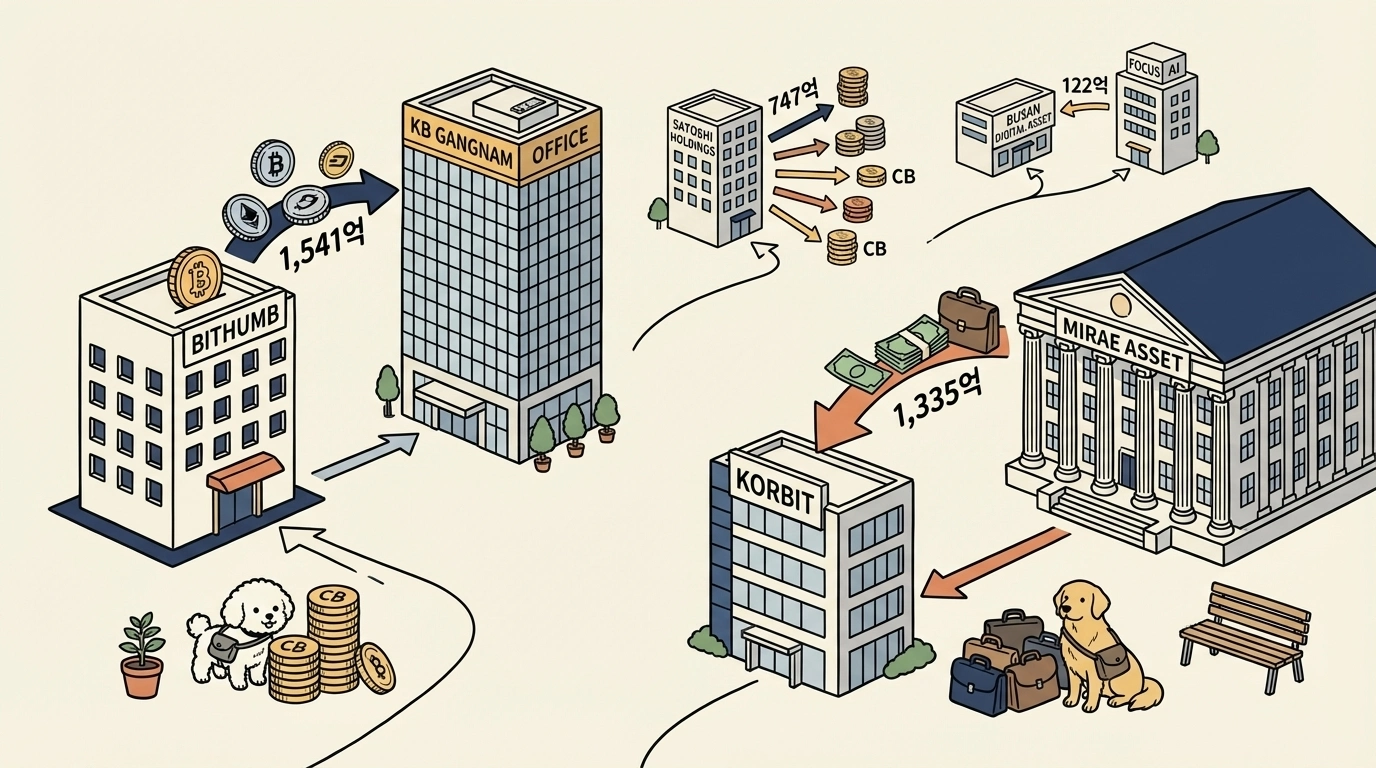2025년 6월 빗썸이 KB강남오피스 위탁관리 부동산투자회사 지분 50%를 1,541억원에 취득했다. 공시상 취득 목적은 '필요 임대차 공간 확보 및 장기적인 투자수익 극대화'다. 8개월 뒤인 2026년 2월 미래에셋컨설팅은 코빗 지분 92.06%를 1,335억원에 취득했다.