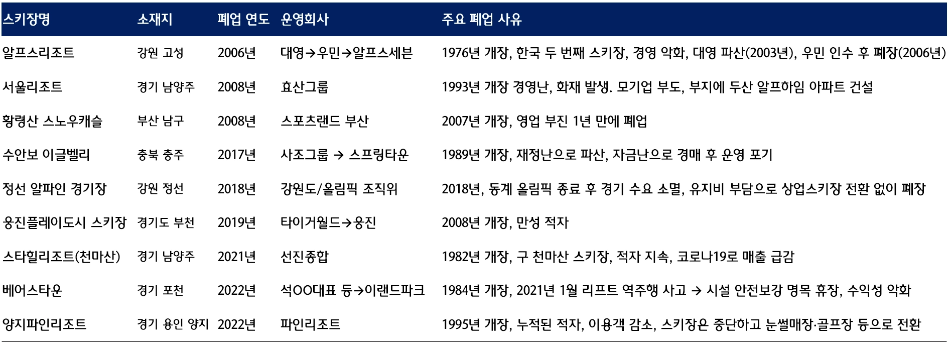 한국 역시 치솟는 전기료와 막대한 수자원 소모, 눈 관리 비용의 증가로 인해 고통받고 있다. 게다가 인공눈의 비중이 과도하게 높아지면서 눈의 질(설질)이 급격히 나빠졌고, 이는 빙판 같은 슬로프에서 부상 위험을 높여 이용객들의 불만을 야기하고 발길을 끊게 만드는 악순환으로 이어지고 있다. 과거 대기업이나 대형 건설사들이 리조트를 지으며 '스키 콘텐츠' 본연의 투자보다는 '콘도 분양 수익'이라는 부동산 모델에만 기대어 온 태생적 한계가 맞물리면서, 운영 비용은 기하급수적으로 폭증하는데 이를 만회할 질적 성장은 정체된 완벽한 구조적 위기에 봉착한 것이다.
