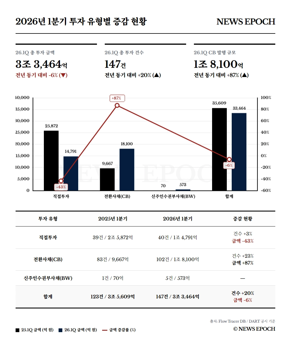2026년 1분기, 대한민국 기업 금융 시장의 지형이 변화하고 있다. 기업의 지분을 직접 사들이던 직접투자 자금은 감소한 반면, 그 빈자리를 전환사채(CB)가 채우고 있다. '확실한 소유'보다는 '안전한 수익'을 고려하는 투자자들의 판단이 반영된 결과로 풀이된다.