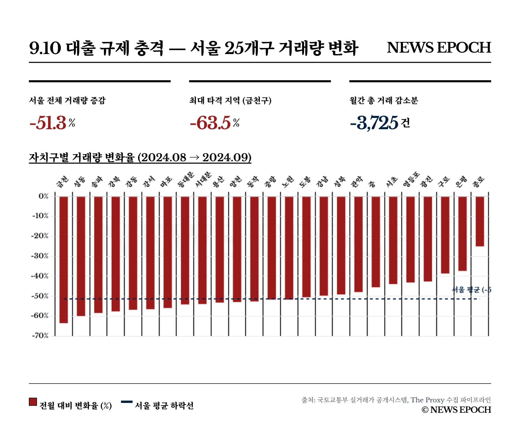 2024년 9월 대출 규제의 충격은 서울 전역에 걸쳤다. 8→9월은 원래 거래가 줄어드는 계절이지만, 전년 동기(2023년) 감소율은 12.1%였다. 2024년의 51.3%는 계절성의 4.2배에 달하는 충격이다. 25개구 전부가 감소했고, 하락 폭은 -25.0%(종로구)에서 -63.5%(금천구)까지 펼쳐졌다.