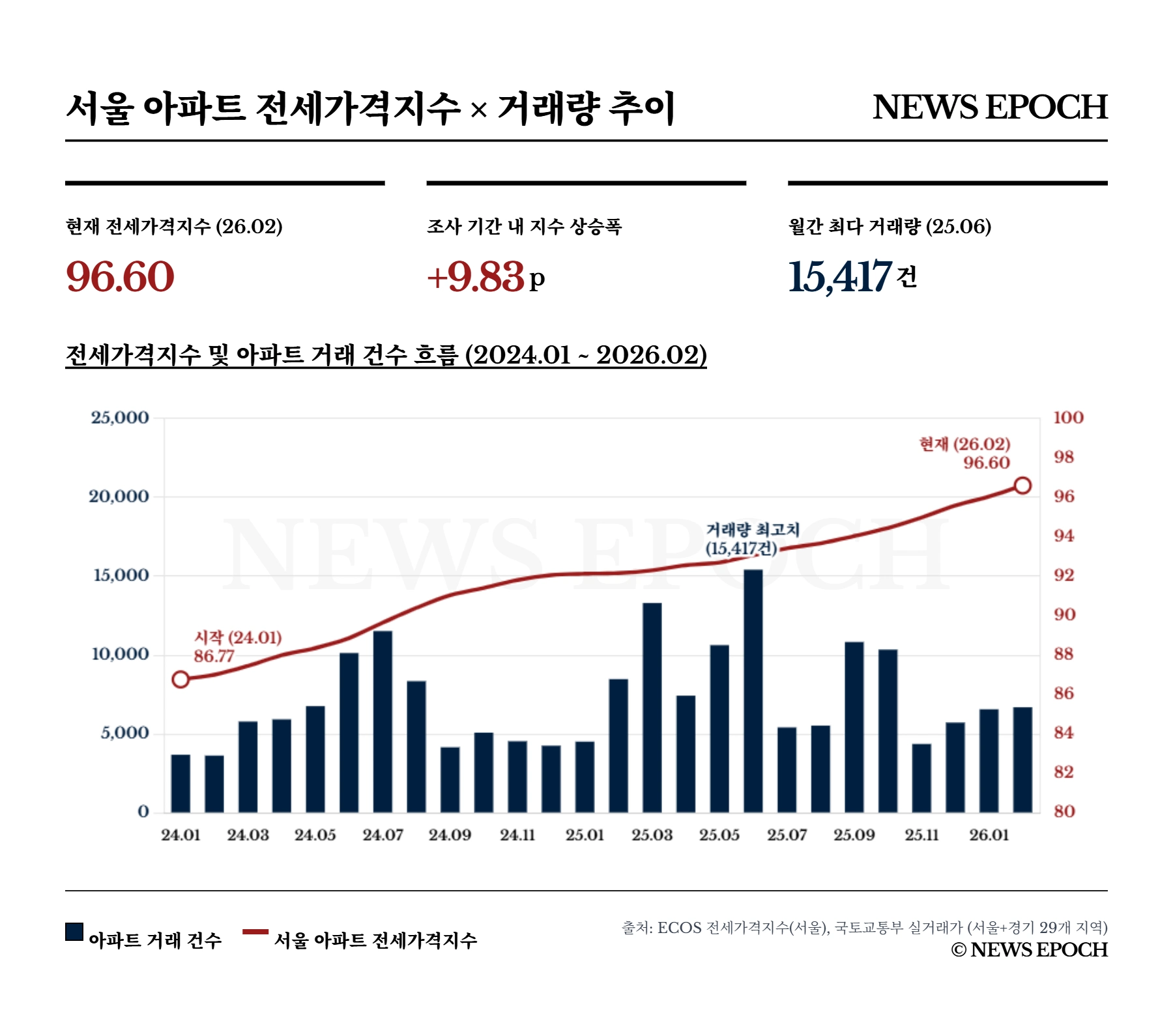 서울 아파트전세가격지수가 이 역설의 한 축을 설명한다. ECOS 데이터에 따르면 서울 아파트전세가격지수는 2024년 1월 86.77에서 2026년 2월 96.60으로, 2년 사이 11.3% 올랐다. 전세가가 오르면 갱신 시 추가 부담이 커지고, 차라리 매매로 전환하는 수요가 발생한다. 이 전환 수요가 높은 주담대금리에도 불구하고 거래를 유지시키는 힘이다.