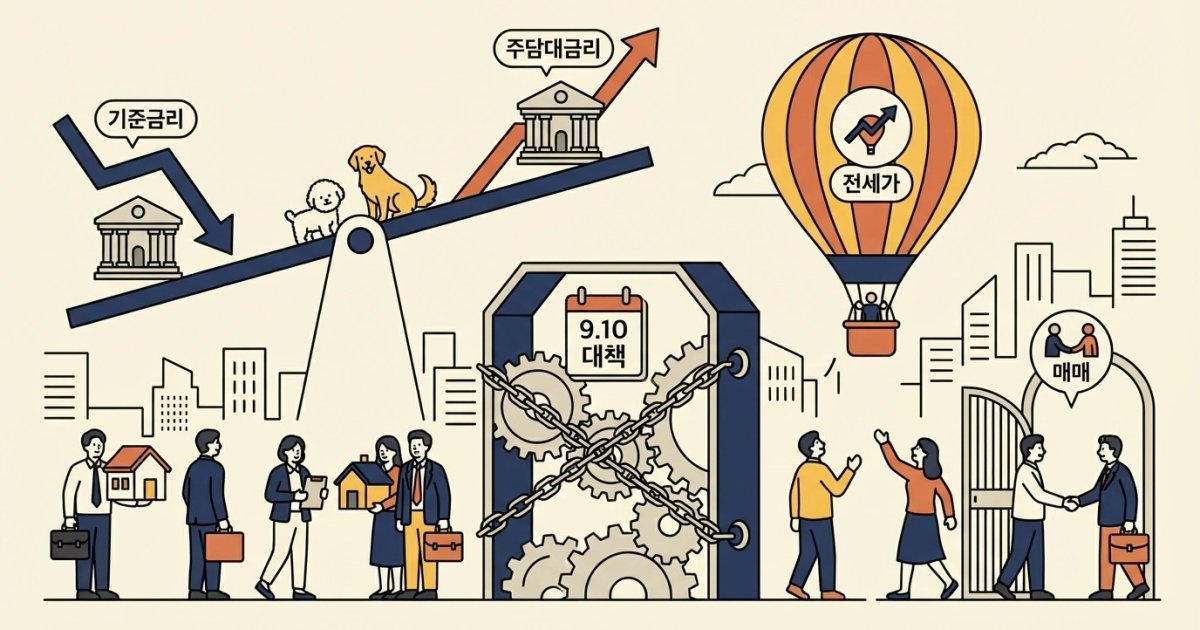 2024년 9월, 정부가 가계부채 관리를 위해 대출 규제(이른바 9.10 대책)를 시행하면서 흐름이 꺾였다. 주담대금리가 3.74%로 뛰었고 거래는 4,166건으로 직전 월 대비 50% 급감했다. 같은 해 10월 한국은행이 기준금리를 3.25%로 인하했지만, 주담대는 4.05%로 오히려 올랐다. 주담대금리는 기준금리가 아닌 COFIX 등 시장금리에 연동되지만, 개인이 체감하는 기준은 한국은행 발표다. 기준금리를 내려도 은행 가산금리가 올라 실제 대출금리가 따라 내리지 않는 구조가 시작됐다.